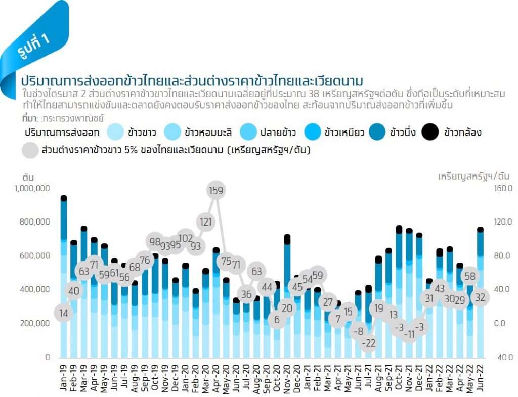มูลค่าการส่งออกข้าวไตรมาสที่ 2 ปี 2022 ขยายตัวต่อเนื่องเป็นไตรมาสที่ 4 ที่ 46.6%YoY โดยมูลค่าการส่งออกข้าวขาวยังคงขยายตัวถึง 34.9%YoY จากปัจจัยด้านปริมาณการส่งออกที่ขยายตัวถึง 62.6%YoY เพราะค่าเงินบาทที่อ่อนค่า ทำให้ราคาส่งออกข้าวขาวอยู่ในระดับที่สามารถแข่งขันกับประเทศคู่แข่งอย่างเวียดนามและอินเดียได้มากขึ้น อีกทั้งมีการเร่งนำเข้าเพื่อกักตุน จากความกังวลของคู่ค้าหลังสถานการณ์สงครามรัสเซีย-ยูเครนมีแนวโน้มยืดเยื้อมากกว่าที่คาด นอกจากนี้ ยังมีปัจจัยบวกจากการฟื้นความสัมพันธ์ระหว่างไทยกับซาอุดิอาระเบีย ทำให้สามารถขยายตลาดสู่ตลาดตะวันออกกลางได้มากขึ้น เช่นเดียวกับมูลค่าการส่งออกข้าวหอมมะลิที่ยังขยายตัว 67.3%YoY จากปริมาณการส่งออกที่ขยายตัวถึง 87.0%YoY จากผลของค่าเงินบาทที่อ่อนค่า อย่างไรก็ตาม ผู้ส่งออกข้าวยังคงเผชิญปัญหาต้นทุนค่าระวางที่อยู่ในระดับสูงและปัญหาขาดแคลนแรงงานในการขนส่งสินค้า ทำให้ต้นทุนการขนส่งยังอยู่ในระดับสูง