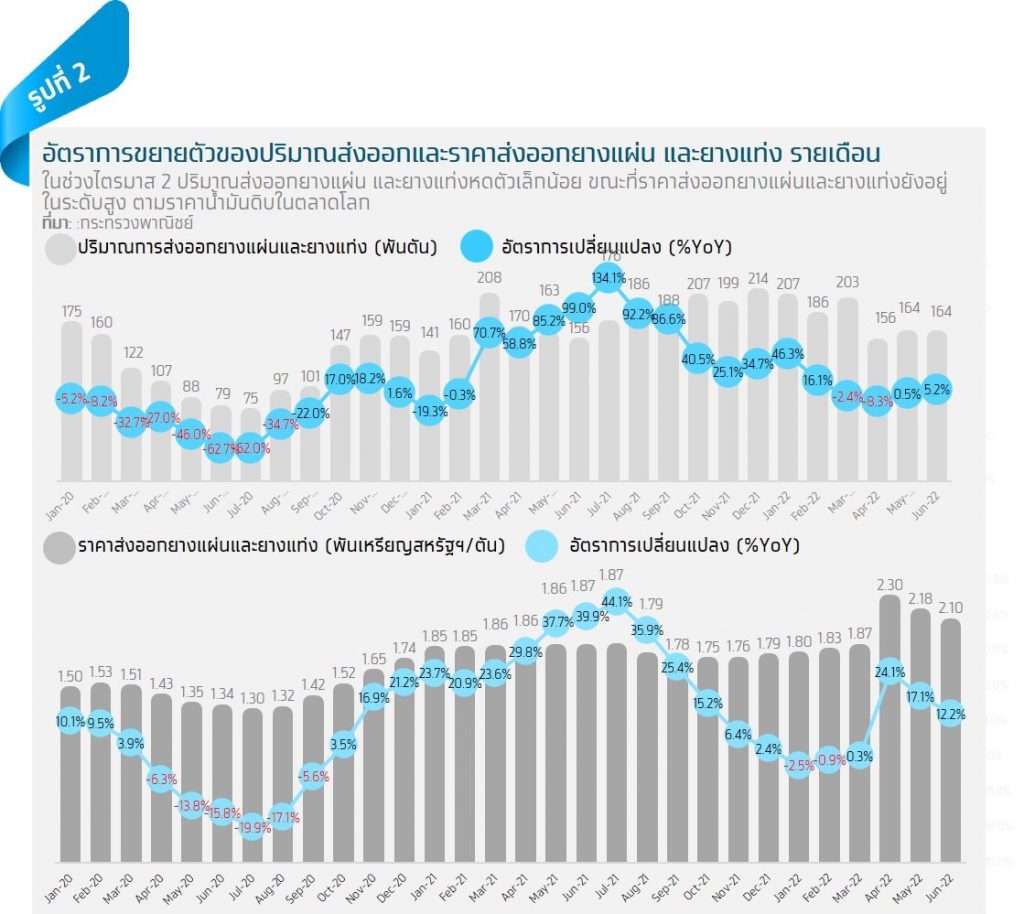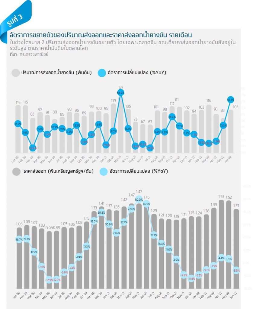 มูลค่าส่งออกยางพาราไตรมาสที่ 2 ปี 2022 ขยายตัว 3.0%YoY ชะลอลงจากไตรมาสก่อนซึ่งขยายตัว 6.2%YoY โดยมูลค่าส่งออกยางแผ่น และยางแท่งหดตัว 0.6%YoY ตามปริมาณส่งออกที่ลดลง 1.0% จากการที่จีนใช้มาตรการล็อกดาวน์เพื่อดำเนินนโยบาย Zero COVID ทำให้โรงงานผลิตยานยนต์บางส่วนต้องหยุดการผลิตชั่วคราว ขณะเดียวกันราคาส่งออกยางแผ่นและยางแท่ง ยังปรับตัวลดลงตั้งแต่เดือนพฤษภาคม เนื่องจากมีความกังวลว่าเศรษฐกิจโลกอาจเข้าสู่ภาวะถดถอย แต่กระนั้นยังถือว่าสูงกว่าช่วงเดียวกันของปีก่อน ส่วนมูลค่าส่งออกน้ำยางข้นเพิ่มขึ้น 12.2%YoY โดยมาจากปัจจัยด้านปริมาณที่ขยายตัวเพิ่มขึ้นถึง 13.4%YoY ตามตลาดจีน ซึ่งเป็นตลาดหลัก (รองจากมาเลเซีย) มีปริมาณส่งออกเพิ่มขึ้นถึง 63.5%YoY เนื่องจากความต้องการใช้น้ำยางข้นเพื่อเป็นวัตถุดิบการผลิตถุงมือยางทางการแพทย์ที่เพิ่มขึ้น จากมาตรการที่เข้มงวดในการจัดการการแพร่ระบาด COVID-19 ของจีน ส่วนตลาดมาเลเซียซึ่งเป็นตลาดส่งออกหลักอันดับ 1 ของไทยและเป็นประเทศผู้ผลิตและส่งออกถุงมือยางรายใหญ่ของโลก มีปริมาณและมูลค่าส่งออกลดลง 1.0% และ 3.0%YoY ตามลำดับ จากความต้องการใช้น้ำยางข้นเพื่อเป็นวัตถุดิบในการผลิตถุงมือยางเพื่อส่งออกที่ลดลง หลังสถานการณ์การแพร่ระบาดของ COVID-19 ในหลายประเทศคลี่คลาย อย่างไรก็ตาม เมื่อพิจารณาภาพรวมมูลค่าส่งออกน้ำยางข้นในช่วงครึ่งปีแรกยังหดตัว 3.6%YoY