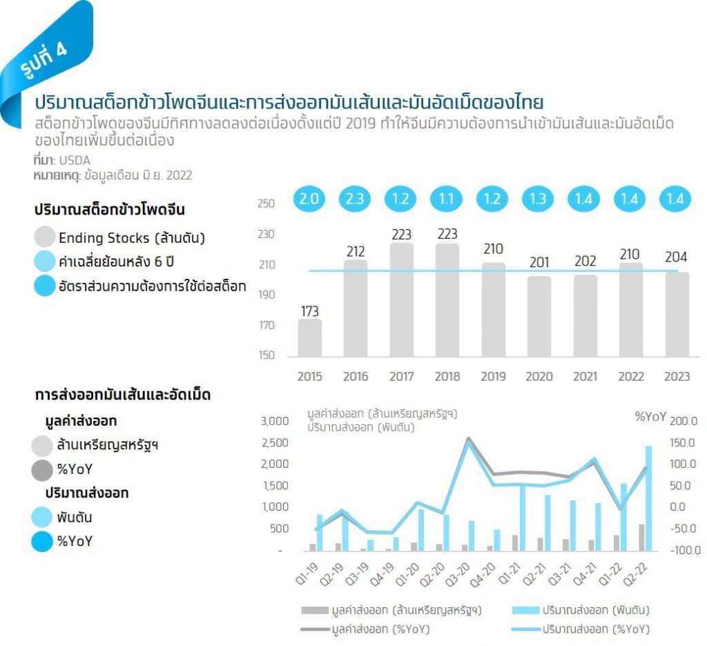 คาดว่าในปี 2022-2023 สต็อกข้าวโพดจีนจะอยู่ที่ 210 ล้านตัน และ 204 ล้านตัน ตามลำดับ ซึ่งเป็นระดับที่ต่ำกว่าหรือใกล้เคียงค่าเฉลี่ยสต็อกข้าวโพดจีน 6 ปีย้อนหลังซึ่งอยู่ที่ 207 ล้านตัน ทำให้ในปี 2022-2023 ค่าเฉลี่ยส่วนต่างราคาข้าวโพดในจีนเทียบกับราคาส่งออกมันเส้นจะยังอยู่ที่ 170-190 USD/ตัน ซึ่งเป็นระดับสูงใกล้เคียงกับปี 2021 และสูงกว่าในปี 2017-2020 ซึ่งอยู่ที่ 50-100 USD/ตัน จึงน่าจะยังส่งผลดีต่อปริมาณส่งออกมันเส้นและมันอัดเม็ดไทย