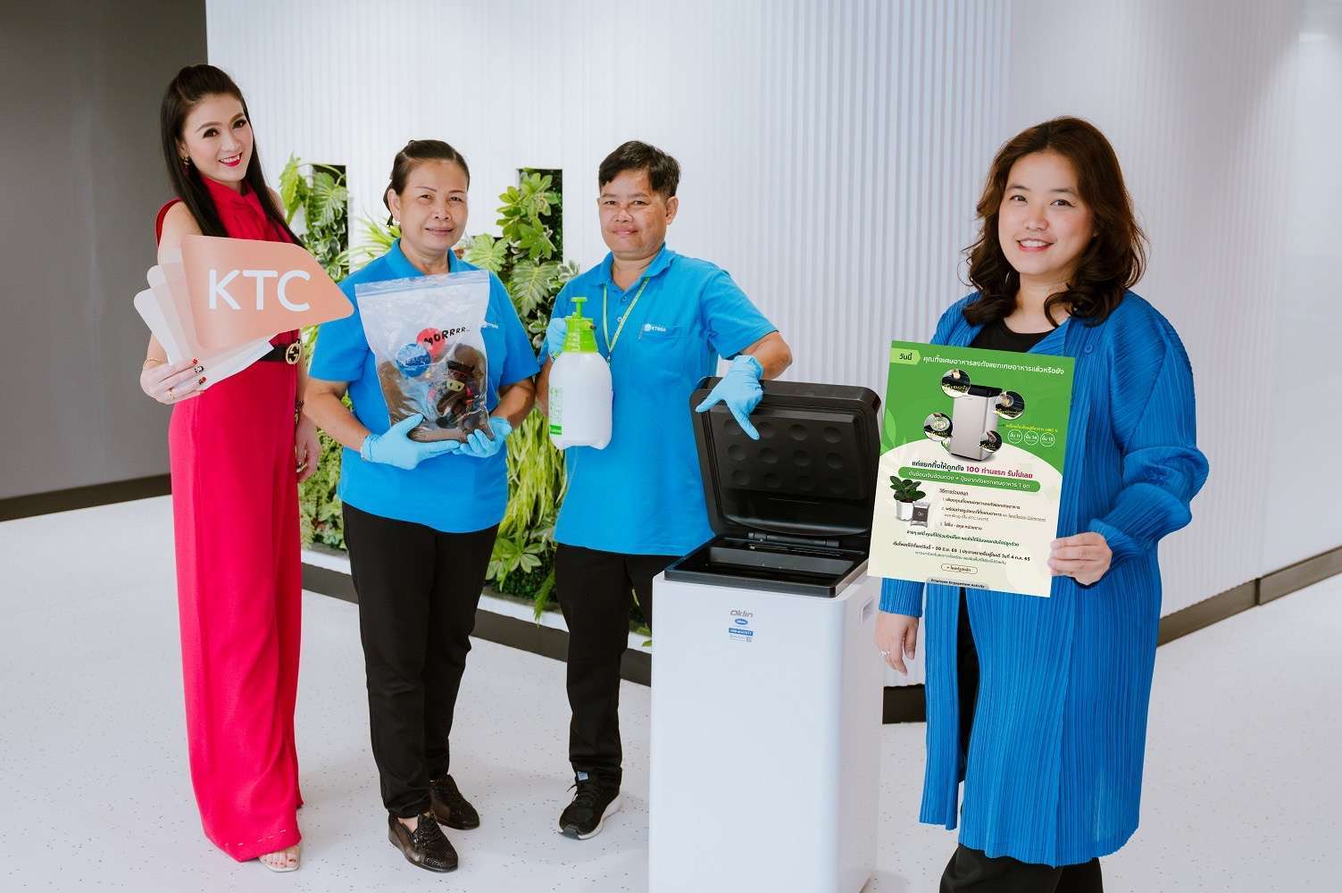 นางสาวดวงกมล อินทรพราหมณ์ (ขวา) ผู้อำนวยการ – บริหารเงินและการพัฒนาเพื่อความยั่งยืน “เคทีซี” หรือ บริษัท บัตรกรุงไทย จำกัด (มหาชน) เผยว่า “เคทีซีได้ขับเคลื่อนนโยบายในการดำเนินธุรกิจ โดยคำนึงถึงมิติเศรษฐกิจ สังคมและสิ่งแวดล้อม โดยล่าสุดเพื่อขานรับนโยบายเรื่อง Zero Waste หรือ “แนวคิดขยะเป็นศูนย์” จึงได้ติดตั้งเครื่องกำจัดเศษอาหารภายในเคทีซี เพื่อแปรรูปขยะอาหารให้เป็นปุ๋ยอินทรีย์คุณภาพสูงด้วยการใช้จุลินทรีย์ย่อยสลาย ซึ่งสามารถลดปริมาณขยะจากอาหารเหลือทิ้งได้ 80-90% ภายในเวลา 24 ชั่วโมง โดยปุ๋ยอินทรีย์ที่ได้จากเครื่องกำจัดเศษอาหารนี้จะมอบให้พนักงาน และใช้บำรุงรักษาต้นไม้ภายในบริษัทฯ ซึ่งนอกจากจะช่วยลดปริมาณขยะแล้ว ยังสามารถลดภาระการจัดการขยะ และส่งเสริมการลดปริมาณก๊าซเรือนกระจกที่ทำให้เกิดภาวะโลกร้อนหรือโลกรวนอีกด้วย