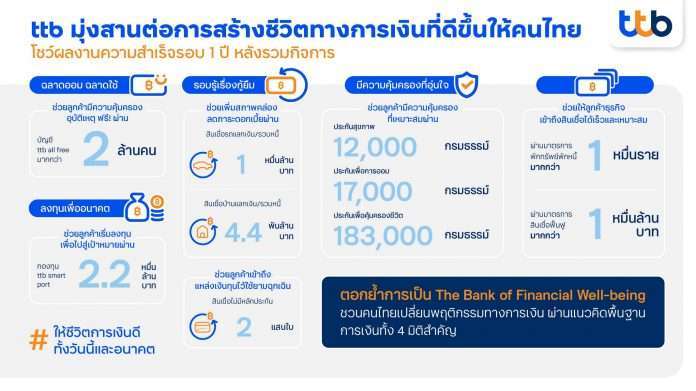 ทีเอ็มบีธนชาต หรือ ทีทีบี โชว์ความแข็งแกร่งหลังการรวมกิจการครบ 1 ปี สร้างผลงานด้วยกำไรสุทธิครึ่งแรกของปี 2565 จำนวน 6,633 ล้านบาท เพิ่มขึ้น 25% สะท้อนถึงความสำเร็จทางธุรกิจที่มาพร้อมกับการช่วยให้ลูกค้ามีชีวิตทางการเงินที่ดีขึ้น ผ่านโซลูชันทางการเงินที่ตอบโจทย์และแก้ปัญหาได้อย่างแท้จริง ภายใต้เป้าหมายการเป็น The Bank of Financial Well-being พร้อมชวนคนไทยเปลี่ยนพฤติกรรมทางการเงิน 4 มิติสำคัญ “ฉลาดออม ฉลาดใช้ – รอบรู้เรื่องกู้ยืม – ลงทุนเพื่ออนาคต – มีความคุ้มครองที่อุ่นใจ” เพื่อรับมือกับสภาวะเศรษฐกิจช่วง Post COVID-19 ที่ยังคงเปราะบาง