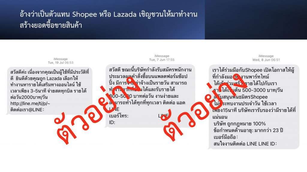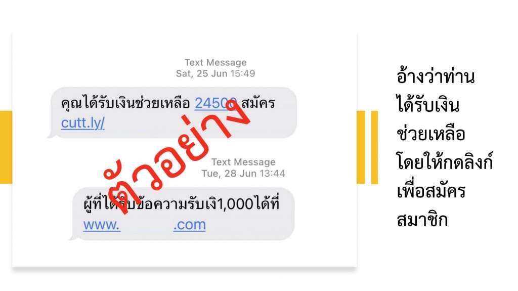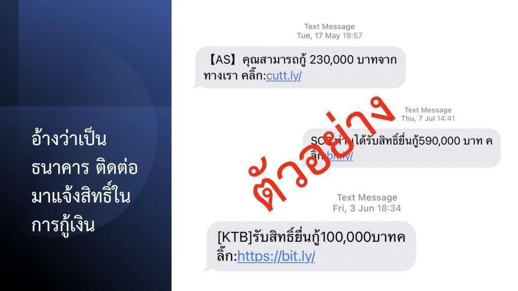 ปัจจุบัน สำนักงานตำรวจแห่งชาติ พบว่า ยังคงมีกลุ่มมิจฉาชีพใช้การส่งข้อความสั้น หรือ SMS ในการหลอกลวงเหยื่อให้กดลิงก์หลอกเอาข้อมูลส่วนบุคคล หลอกเอาทรัพย์สินจากเหยื่อ หลอกให้กู้เงินนอกระบบ หรือหลอกให้เล่นพนันออนไลน์ เป็นจำนวนมาก สำนักงานตำรวจแห่งชาติ มีความห่วงใยพี่น้องประชาชน จึงขอประชาสัมพันธ์แจ้งเตือนให้ทราบถึงกลโกงและวิธีการของกลุ่ม SMS หลอกลวง เพื่อให้พี่น้องประชาชนรู้เท่าทัน และสามารถป้องกันตนเองไม่ให้ตกเป็นเหยื่อของคนร้าย โดยจากการตรวจสอบพบว่าแผนประทุษกรรมในการหลอกลวงผ่าน SMS มี 1.) อ้างว่าท่านเป็นผู้ใช้ TikTok ที่มีประวัติดี เชิญชวนมาทำงานออนไลน์, 2.) อ้างว่าเป็นตัวแทนของ Shopee หรือ Lazada เชิญชวนให้มาทำงานสร้างยอดซื้อขายสินค้า, 3.) อ้างว่าเป็นธนาคาร ติดต่อมาแจ้งสิทธิ์ในการกู้เงิน, 4. ) อ้างว่าท่านได้รับเงินช่วยเหลือ โดยให้กดลิงก์เพื่อสมัครสมาชิก, 5.) อ้างว่าได้รับโบนัสเงินฟรี ชักชวนให้เล่นพนันออนไลน์