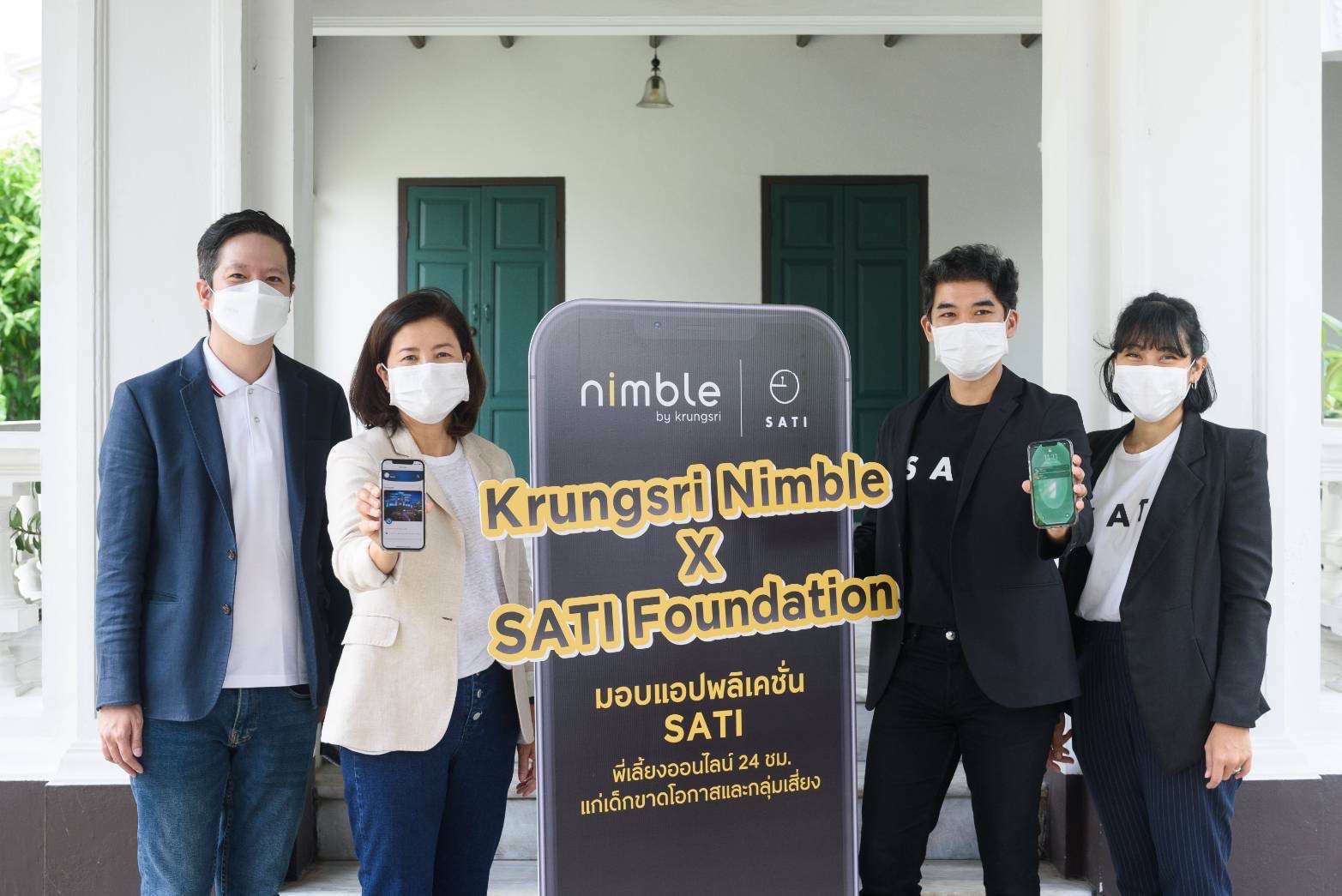 นางสาวสายสุนีย์ หาญประเทืองศิลป์ (ที่ 2 จากซ้าย) ประธานคณะเจ้าหน้าที่ด้านนวัตกรรมดิจิทัลและข้อมูล ธนาคารกรุงศรีอยุธยา จำกัด (มหาชน) พร้อมด้วยนายธีรพงศ์ มหธรรม (ซ้ายสุด) กรรมการผู้จัดการ บริษัท กรุงศรี นิมเบิล จำกัด ส่งมอบแอปพลิเคชัน “SATI” บนแพลตฟอร์ม LINE ให้แก่มูลนิธิสติ โดยบริษัท กรุงศรี นิมเบิล จำกัด ซึ่งเป็นฮับในการสร้างและดูแลโซลูชันด้าน ไอทีในเครือของกรุงศรีเป็นผู้พัฒนาแอปพลิเคชันนี้ เพื่อเป็นเสมือนพี่เลี้ยงออนไลน์ที่คอยช่วยเหลือให้คำปรึกษาด้านการศึกษาและคุณภาพชีวิตแก่เด็กและเยาวชนที่ขาดโอกาสและกลุ่มเสี่ยงตลอด 24 ชั่วโมง โดยมี นายเสกสรร รวยภิรมย์ (ที่ 2 จากขวา) ผู้ก่อตั้งมูลนิธิสติ เป็นผู้รับมอบ งานดังกล่าวจัดขึ้น