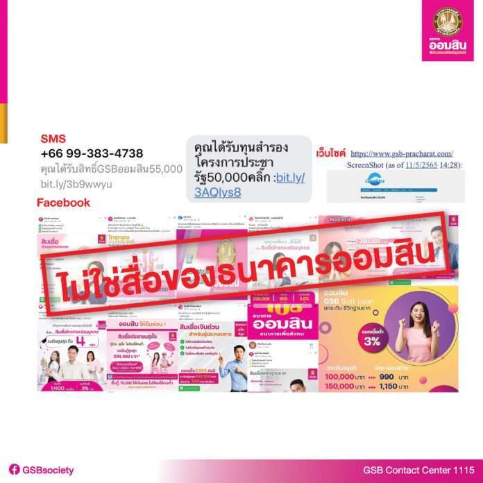 รายงานข่าวจากธนาคารออมสิน แจ้งว่า ตามที่ได้มีกลุ่มมิจฉาชีพ นำชื่อ,โลโก้ ตลอดทั้งสินเชื่อของธนาคารออมสินไปแอบอ้างส่งข้อความสั้น (SMS) หรือตั้งชื่อเพจเฟซบุ๊กและเว็บไซต์ เชิญชวนให้กู้เงินพร้อมแนบลิงก์แอปพลิเคชันไลน์ให้กดรับสิทธิ์ โดยใช้ข้อความเชิญชวนลักษณะกระตุ้นให้เกิดความสนใจ อาทิ คุณได้รับสิทธิ์ยื่นขอสินเชื่อ GSB ออมสิน 60,000 คลิ๊ก, เปิดลงทะเบียนแล้ว, ลงทะเบียนด่วน, ลงทะเบียนที่นี่ เป็นต้น และพยายามเปลี่ยนรูปแบบข้อความเชิญชวนหลากหลายมากยิ่งขึ้น ซึ่งสื่อเหล่านั้นไม่ใช่สื่อของธนาคารออมสิน ธนาคารไม่มีนโยบายในการให้กู้เงินผ่านแอปพลิเคชันไลน์ และธนาคารไม่มีส่วนเกี่ยวข้องกับการเผยแพร่ข้อมูลดังกล่าวใด ๆ ทั้งสิ้น ซึ่งธนาคารได้มีการแจ้งเตือนประชาชนมาอย่างต่อเนื่อง นั้น ขณะนี้ได้มีข้อความสั้น (SMS) เพจเฟซบุ๊กและเว็บไซต์ แอบอ้างเป็นธนาคารออมสินเพิ่มจำนวนมากขึ้น ธนาคารจึงขอแจ้งเตือนประชาชนให้ระมัดระวังอีกครั้ง ขออย่าได้หลงเชื่อ ไม่แอดไลน์สมัครใช้บริการ ไม่กรอกข้อมูลส่วนบุคคลและไม่แชร์ SMS เพจเฟซบุ๊กและเว็บไซต์ที่ไม่ใช่ของธนาคารออมสินอย่างเด็ดขาด โดยสามารถดูรายชื่อเพจปลอมได้ที่ https://www.gsb.or.th/media/2022/08/fake-sms.pdf