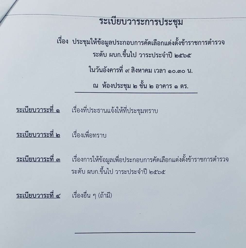 การประชุมในวันนี้มี 4 วาระ ดังนี้ ระเบียบวาระที่ 1 เรื่องที่ประธานแจ้งให้ที่ประชุมทราบ, ระเบียบวาระที่ 2 เรื่องเพื่อทราบ, ระเบียบวาระที่ 3 เรื่องการให้ข้อมูลเพื่อประกอบการคัดเลือกแต่งตั้งข้าราชการตำรวจระดับ ผบก.ขึ้นไป วาระประจำปี 2565, ระเบียบวาระที่ 4 เรื่องอื่น ๆ (ถ้ามี)