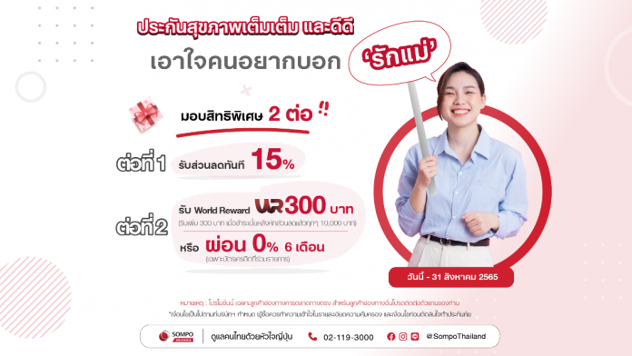 บริษัทซมโปะประกันภัย (ประเทศไทย) จำกัด (มหาชน)ผู้นำด้านการให้บริการประกันวินาศภัยที่ได้ดำเนินธุรกิจในประเทศไทยมากว่า 25 ปีโดยยึดพันธกิจสำคัญในการดูแลคนไทยด้วยหัวใจญี่ปุ่นเดินหน้าตอกย้ำความเป็นผู้นำประกันสุขภาพในประเทศไทยร่วมเป็นส่วนในเทศกาลวันแม่มอบสิทธิประโยชน์ 2 ต่อผ่านประกันสุขภาพเต็มเต็มและประกันสุขภาพดีดีเพื่อมอบเป็นของขวัญแทนใจแก่คนที่คุณรัก