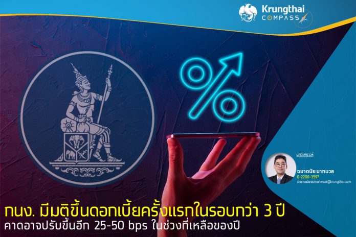 Krungthai COMPASS มองว่าเป็นไปได้ที่ กนง. จะปรับขึ้นอัตราดอกเบี้ยนโยบายอีก 25-50 bps ในช่วงที่เหลือของปี เนื่องจากการส่งสัญญาณดำเนินนโยบายการเงินเข้มงวดขึ้น จากการที่คณะกรรมการเสียงข้างมากถึง 6 ต่อ 1 ท่านที่ลงมติให้ปรับขึ้นดอกเบี้ยนโยบายร้อยละ 0.25 สู่ระดับร้อยละ 0.75 ต่อปี และมีกรรมการเสียงข้างน้อย 1 ท่านเห็นควรให้ปรับขึ้นถึงร้อยละ 0.50 ต่อปี ประกอบกับการประเมินภาพเศรษฐกิจของ กนง. ที่ระบุว่า เศรษฐกิจไทยมีแนวโน้มฟื้นตัวอย่างชัดเจนจากจำนวนนักท่องเที่ยวต่างชาติที่เพิ่มขึ้นมากกว่าคาด สอดคล้องกับมุมมองของ Krungthai COMPASS ที่คาดว่าจำนวนนักท่องเที่ยวต่างชาติมีแนวโน้มฟื้นตัวดีขึ้น และมีโอกาสแตะระดับ 7-8 ล้านคนในปี 2022
