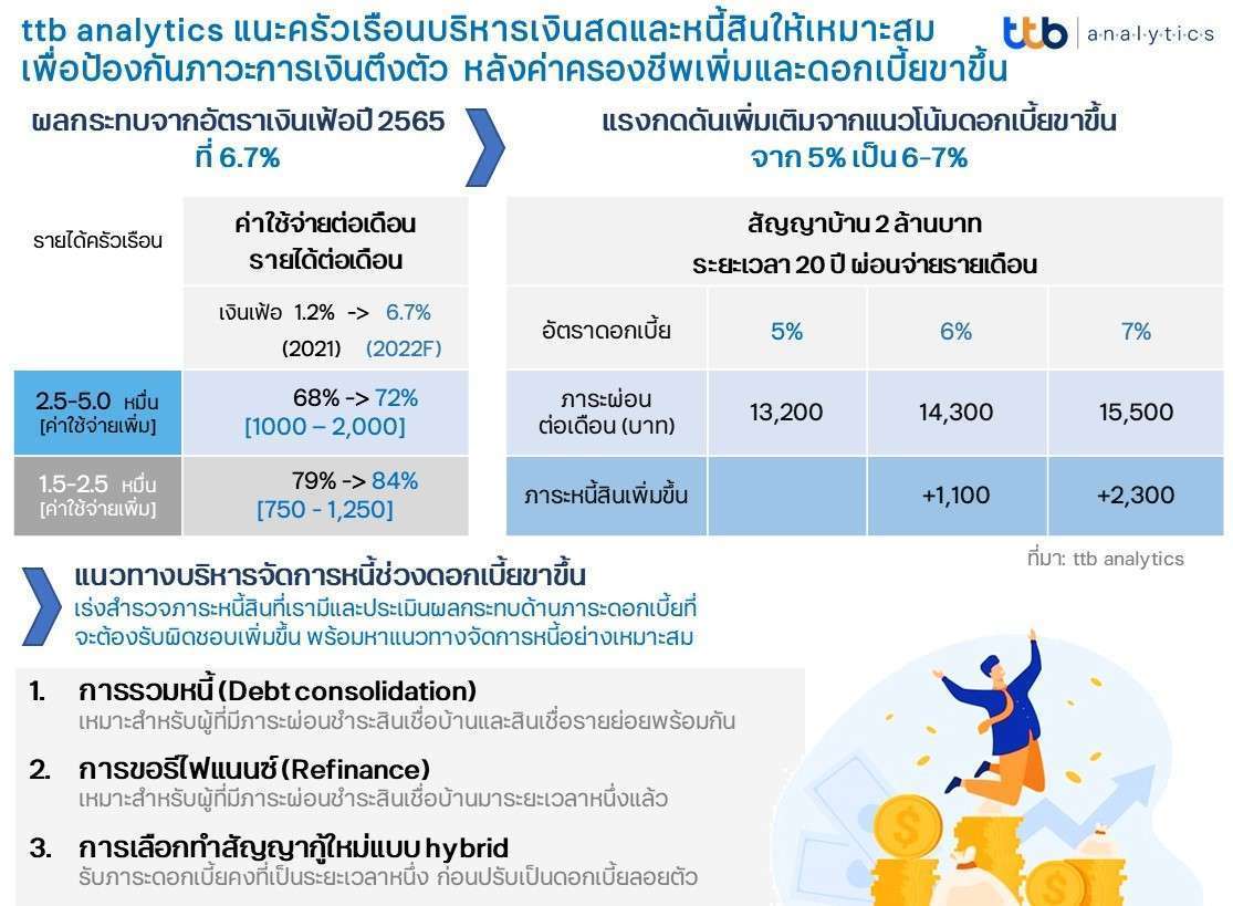 ล่าสุด สมาคมธนาคารไทยและธนาคารสมาชิก เห็นพ้องกันในการปรับจังหวะและขนาดการขึ้นอัตราดอกเบี้ยของธนาคารพาณิชย์อย่างค่อยเป็นค่อยไป หลัง กนง. เริ่มปรับทิศทางอัตราดอกเบี้ยนโยบายเข้าสู่ภาวะปกติมากขึ้น อีกทั้ง ยังพร้อมเข้าให้การช่วยเหลือลูกหนี้ โดยเฉพาะกลุ่มเปราะบาง เพื่อลดผลกระทบจากภาระค่าครองชีพสูงและดอกเบี้ยขาขึ้นที่จะมีต่อลูกค้า และเพื่อช่วยประดับประคองกิจกรรมทางเศรษฐกิจไทยโดยรวมให้ฟื้นตัวต่อไปได้อย่างไม่สะดุด อย่างไรก็ตาม ลูกหนี้เองก็จำเป็นต้องมีแนวทางบริหารจัดการเงินสดและหนี้ครัวเรือนของตนเองอย่างเหมาะสม ซึ่งถือเป็นเรื่องสำคัญมากในช่วงเวลาเช่นนี้ ดังนั้น จึงควรเร่งสำรวจภาระหนี้สินและประเมินผลกระทบด้านภาระดอกเบี้ยที่จะต้องรับผิดชอบเพิ่มขึ้น เพื่อเตรียมความพร้อมบริหารเงินสดครัวเรือนและหาแนวทางบริหารจัดการหนี้ให้ลดลงได้อย่างต่อเนื่องเหมาะสม และเพื่อป้องกันปัญหาภาวะการเงินครัวเรือนตึงตัวที่อาจเกิดขึ้นได้