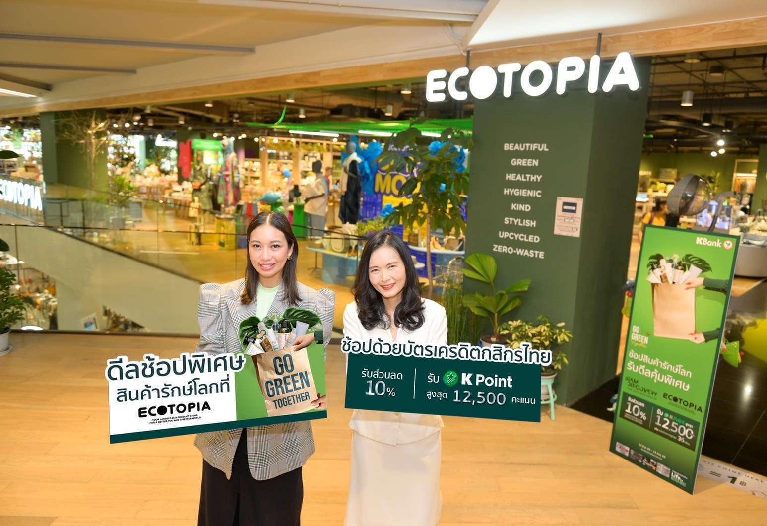 นางสาวอรธิดา บุณเปี่ยมศักดิ์ ผู้ช่วยกรรมการผู้จัดการ ธนาคารกสิกรไทย (ขวา) ร่วมกับ นางสาวปวีณา คชเสนี ผู้อำนวยการฝ่ายบริหารสินค้า สยามดิสคัฟเวอรี่ เชิญชวนนักช้อป “Go Green Together” รับดีลพิเศษเมื่อใช้จ่ายผ่านบัตรเครดิตกสิกรไทยที่ ECOTOPIA พื้นที่ไลฟ์สไตล์คนรักษ์โลกที่มีสินค้าเป็นมิตรกับสิ่งแวดล้อมเต็มรูปแบบที่สุดในเอเชีย บนชั้น 3 ศูนย์การค้าสยาม ดิสคัฟเวอรี่ ดิเอ็กซ์พลอราทอเรี่ยม ดีลช้อปรักษ์โลกที่ ECOTOPIA กับบัตรเครดิตกสิกรไทย รับส่วนลด 2 ต่อ