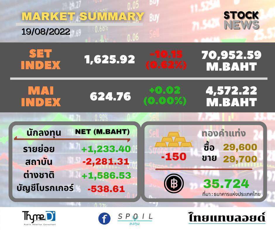 ตลาดหลักทรัพย์ ปิดวันนี้ที่ระดับ 1,625.92 จุด ลดลง 10.15 จุด (-0.62%) มูลค่าการซื้อขาย 70,952.59 ล้านบาท