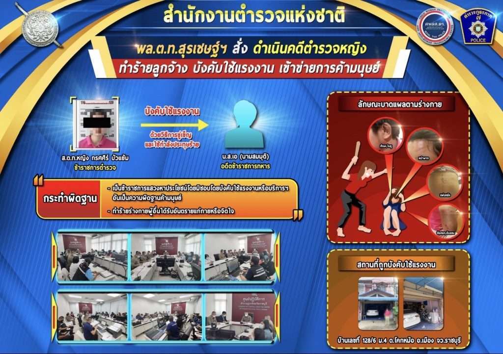 วันที่ 20 สิงหาคม 2565 ที่ สภ.เมื่องราชบุรี รายงานว่า จากกรณีมีอดีตทหารหญิง เข้าแจ้งความร้องทุกข์ดำเนินคดีกับเจ้าหน้าที่ตำรวจซึ่งเป็นนายจ้างของตนบังคับใช้แรงงานดูแลรับใช้  และทำร้ายร่างกาย เช่น ถูกตบตีตามร่างกาย ถูกเครื่องช็อตไฟฟ้าช็อตตามร่างกาย ใช้ไม้หน้าสามตีที่ใบหน้า เป็นต้น ในพื้นที่จังหวัดราชบุรี ตามที่ปรากฏในข่าวและสื่อต่างๆ ไปแล้วนั้น จากกรณีดังกล่าว พล.ต.อ.สุวัฒน์ แจ้งยอดสุข ผบ.ตร. จึงได้สั่งการให้ พล.ต.อ.รอย อิงคไพโรจน์ รอง ผบ.ตร./ผอ.ศพดส.ตร. และ พล.ต.ท.สุรเชษฐ์ หักพาล ผู้ช่วย ผบ.ตร./รอง ผอ.ศพดส.ตร. ดำเนินการสืบสวนข้อเท็จจริงดังกล่าว เนื่องจากเป็นคดีที่ประชาชนและสื่อมวลชนให้ความสนใจเป็นอย่างมาก รวมทั้งมีเจ้าหน้าที่ตำรวจมีส่วนเกี่ยวข้อง จึงต้องเร่งทำความจริงให้กระจ่างและกำชับให้ดำเนินการตามขั้นตอนของกฎหมายอย่างเคร่งครัด พล.ต.ท.สุรเชษฐ์ฯ จึงได้สั่งการให้ พล.ต.ท.ธนายุตม์ วุฒิจรัสธำรงค์ ผบช.ภ.7, พล.ต.ต.ปิติ นฤขัตรพิชัย ผบก.ภ.จว.ราชบุรี และชุดปฏิบัติการ ศพดส.ตร. ออกสืบสวนติดตามคดีอย่างเร่งด่วน และให้นำผู้เสียหายเข้าสู่กระบวนการคัดแยกเหยื่อจากการค้ามนุษย์ร่วมกับสหวิชาชีพ   เพื่อพิจารณารายละเอียดพฤติการณ์ให้ครบถ้วน