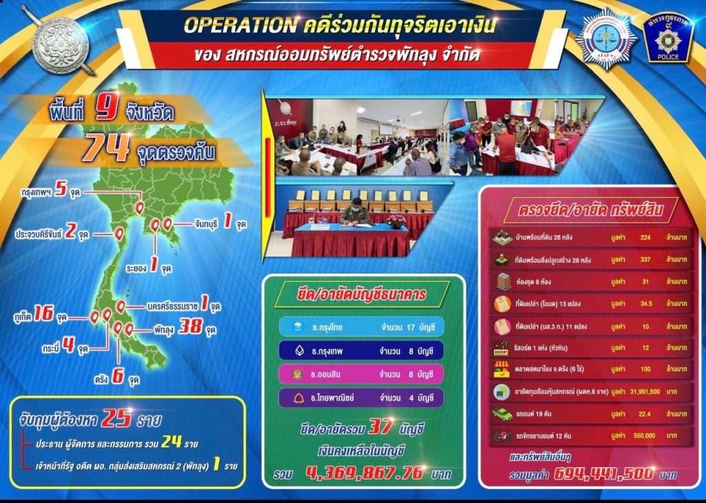 จากการตรวจสอบเส้นทางการเงินของเจ้าหน้าที่ พบว่ามีการเงินออกจากบัญชีสหกรณ์ออมทรัพย์ไปยังเครือญาติใกล้ชิดของกลุ่มเครือข่ายผู้ต้องหา ในเขตพื้นที่ 9 จังหวัด จึงได้ทำการอายัดบัญชีธนาคารและในวันนี้ (22 ส.ค.65) ได้ขออนุมัติหมายค้นศาลอาญา เพื่อเข้าตรวจค้น 74 เป้าหมายในพื้นที่ 9 จังหวัด ได้แก่ พัทลุง, ภูเก็ต, นครศรีธรรมราช, ตรัง, กระบี่, ประจวบคีรีขันธ์, จันทบุรี, ระยอง และกรุงเทพมหานคร โดยผลการตรวจค้น สรุปการดำเนินการ ดังนี้ (1.) อายัดบัญชีผู้ต้องหา รวมจำนวน 37 บัญชี เงินคงเหลือในบัญชี 4,369,867.76 บาท, (2.) ตรวจยึดบ้านพร้อมที่ดิน 28 หลัง, (3.) ที่ดินพร้อมสิ่งปลูกสร้าง 28 หลัง, (4.) ห้องชุด 6 ห้อง, (5.) ที่ดินเปล่า(โฉนด) 13 แปลง, (6.) ที่ดินเปล่า (นส.3 ก.) 11 แปลง, (7.) รีสอร์ต 1 แห่ง (หัวหิน), (8.) ตลาดสดนาโยง จ.ตรัง (6 ไร่), (9.) อายัดทุนเรือนหุ้นสหกรณ์ (ผู้ต้องหา 6 ราย), (10.) รถยนต์ 19 คัน รถจักรยานยนต์ 12 คันและทรัพย์สินอื่นๆ จำนวนหลายรายการ รวมมูลค่าทรัพย์สินที่ยึดอายัด ทั้งหมด 694,441,500 บาท