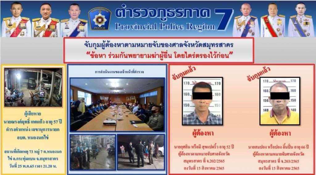 วันที่ 22 ส.ค. 65 เวลา 12.00 น.ที่ สภ.กระทุ่มแบน ต.ตลาดกระทุ่มแบน อ.กระทุ่มแบน จ.สมุทรสาคร พล.ต.ท.ธนายุตม์ วุฒิจรัสธำรงค์ ผบช.ภ.7 พร้อมด้วย พล.ต.ต.บุญญฤทธิ์ รอดมา รอง ผบช.ภ.7, พล.ต.ต.อภิชาติ วรรณภักดิ์ ผบก.ภ.จว.สมุทรสาคร, พ.อ.ปิยะ เกียรติอมรเวช รอง ผอ.กอ.รมน.จังหวัดสมุทรสาคร (ฝ่ายทหาร), พ.ต.อ.พัฒน์ปกรณ์ ชั้นประเสริฐรอง ผบก.ภ.จว.สมุทรสาคร, พ.ต.อ.อภิชิต สุรพินิจ รอง ผบก.สส.ภ.7, พ.ต.อ.ศุภชัย ไตรสมบูรณ์ นวท.(สบ.5) ศพฐ.7, พ.ต.อ.เสรีฐกาญจน์ จันทร์ด้วง ผกก.สภ.กระทุ่มแบน, พ.ต.อ.ยอดชาย แก้วเรือง ผกก.สส.ภ.จว.สมุทรสาคร, พ.ต.อ.เชิดศักดิ์ รอดเข็ม ผกก.สส.2 บก.สส.ภ.7 พร้อมเจ้าหน้าที่ที่เกี่ยวข้องได้ร่วมกันแถลงข่าวจับกุมตัวผู้ต้องหาตามหมายจับ ก่อคดีอุกฉกรรจ์สะเทือนขวัญ จำนวน 2 ราย ได้แก่ (1.) นายกุศลิน หรือ มี สุขแปดริ้ว อายุ 52 ปี ตามหมายจับ ศาลจังหวัดสมุทรสาคร ที่ จ.202/2565 ลง 15 สิงหาคม 2565, (2.) นายสมปอง หรือ ปอง ลิ้นปิ่น อายุ 66 ปี ตามหมายจับศาลจังหวัดสมุทรสาคร ที่ จ.203/2565 ลง 15 สิงหาคม 2565 โดยกล่าวหาว่ากระทำความผิดฐาน “ร่วมกันพยายามฆ่าผู้อื่นโดยไตร่ตรองไว้ก่อน