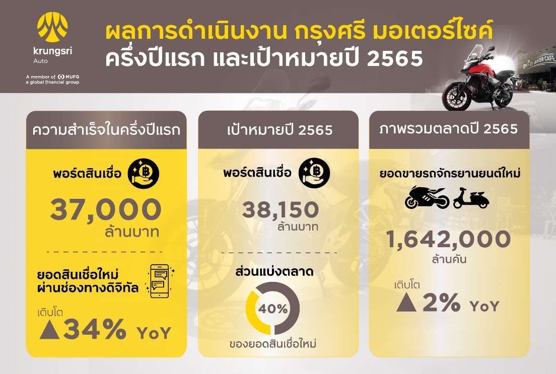 นางสาวชญาน์ธิป กล่าวเสริมว่า “สำหรับในครึ่งหลังของปี 2565 เรามองว่าตลาดรถจักรยานยนต์จะเติบโตได้ต่อไป จากการบริโภคภาคเอกชนที่มีแนวโน้มฟื้นตัวต่อเนื่องและรายได้ครัวเรือนที่ปรับตัวดีขึ้น โดยคาดว่ายอดขายรถจักรยานยนต์ทั้งปีจะอยู่ที่ 1,642,000 คัน หรือคิดเป็นอัตราการเติบโต 2% อย่างไรก็ดี สถานการณ์เศรษฐกิจโดยรวมยังคงมีความไม่แน่นอนสูง กรุงศรี มอเตอร์ไซค์ จึงพร้อมทำงานอย่างใกล้ชิดกับพันธมิตรธุรกิจทุกราย โดยอาศัยความเข้าใจกลุ่มลูกค้าที่หลากหลาย การวิเคราะห์ข้อมูลเชิงลึก และโซลูชันสินเชื่อรถจักรยานยนต์ที่ครบวงจรที่สุดในตลาด ทั้งสำหรับลูกค้ารายย่อยและผู้แทนจำหน่ายรถจักรยานยนต์ (อินเวนทอรี่ ไฟแนนซ์) รวมทั้งตอบสนองความต้องการด้านยานยนต์ไฟฟ้าของกลุ่มผู้บริโภคยุคใหม่ ผ่านการให้บริการสินเชื่อรถจักรยานยนต์ไฟฟ้า โดยกรุงศรี มอเตอร์ไซค์ ถือเป็นแบรนด์แรกในตลาดที่รุกเซกเมนต์นี้อย่างจริงจัง และเป็นแบรนด์เดียวที่ให้บริการสินเชื่อมอเตอร์ไซค์ไฟฟ้าแก่ทุกรุ่น ทุกแบรนด์ เพื่อส่งเสริมให้ผู้ใช้รถมีชีวิตที่ดีขึ้น และขับเคลื่อนการเติบโตอย่างมีเสถียรภาพของอุตสาหกรรมในภาพรวม”