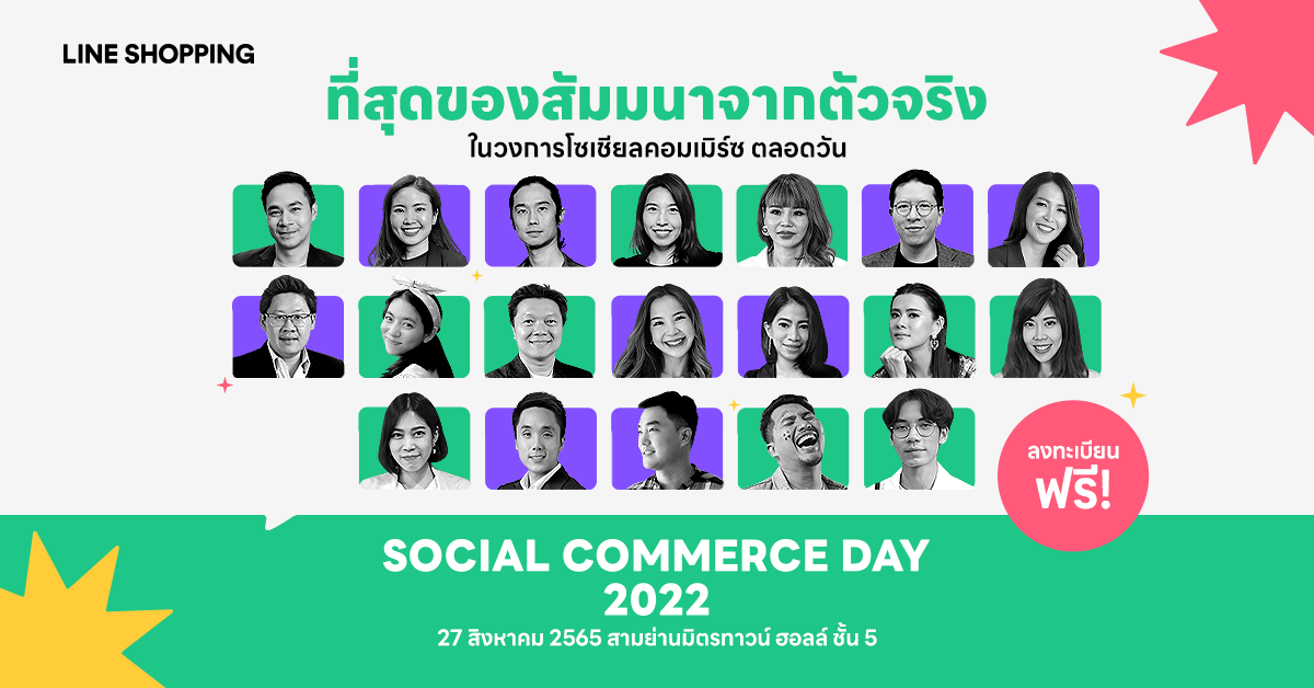 งานนี้รับรองว่าได้ทั้งสาระความรู้และพลังใจ ผู้ที่สนใจร่วมเติบโตอย่างยั่งยืนไปกับ LINE SHOPPING และโซเชียลคอมเมิร์ซ สามารถเข้าร่วมงาน “Social Commerce Day 2022 สปาร์คพลังใจ ขายออนไลน์ให้ก้าวกระโดด” ได้ ฟรี! ในวันเสาร์ที่ 27 สิงหาคม 2565 เวลา 9:00 น. – 18:00 น. ณ สามย่านมิตรทาวน์ฮอลล์ ชั้น 5 ดูรายละเอียดและลงทะเบียนเข้าร่วมงานได้ที่ www.socialcommerceday.com หรือรับชมไลฟ์ได้ทาง LINE Official Account: @linemyshop