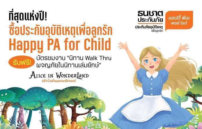 ธนชาตประกันภัย ชวนว้าวแบบยกกำลังสอง ว้าวแรกกับ “Happy PA for Child” ประกันภัยนวัตกรรมใหม่ที่พัฒนาออกมาในรูปแบบไฮบริด ผสมผสานระหว่างประกันภัยอุบัติเหตุและประกันภัยสุขภาพสำหรับกลุ่มครอบครัว ที่คุ้มครองครบ จบทั้งอุบัติเหตุและโรคฮิตในเด็ก และงานเด็กที่ว้าวที่สุดแห่งปี 2565 งาน “รักลูกนิทาน Walk Thru การผจญภัยในนิทานเล่มยักษ์” เพียงแค่ทำประกันภัยที่ทีเอ็มบีธนชาต ตั้งแต่วันนี้ – 31 ตุลาคม 2565 รับฟรี!บัตร เข้าชมงานนิทานในดวงใจผจญภัยไปกับอลิซในดินแดนมหัศจรรย์ (Alice in Wonderland) งานนิทาน Pop-up ขนาดใหญ่ ที่เตรียมยกขบวนบุกไปเติมเต็มจินตนาการให้กับน้องๆ ใน 6 จังหวัด ตั้งแต่เดือนสิงหาคมถึงเดือนพฤศจิกายนนี้