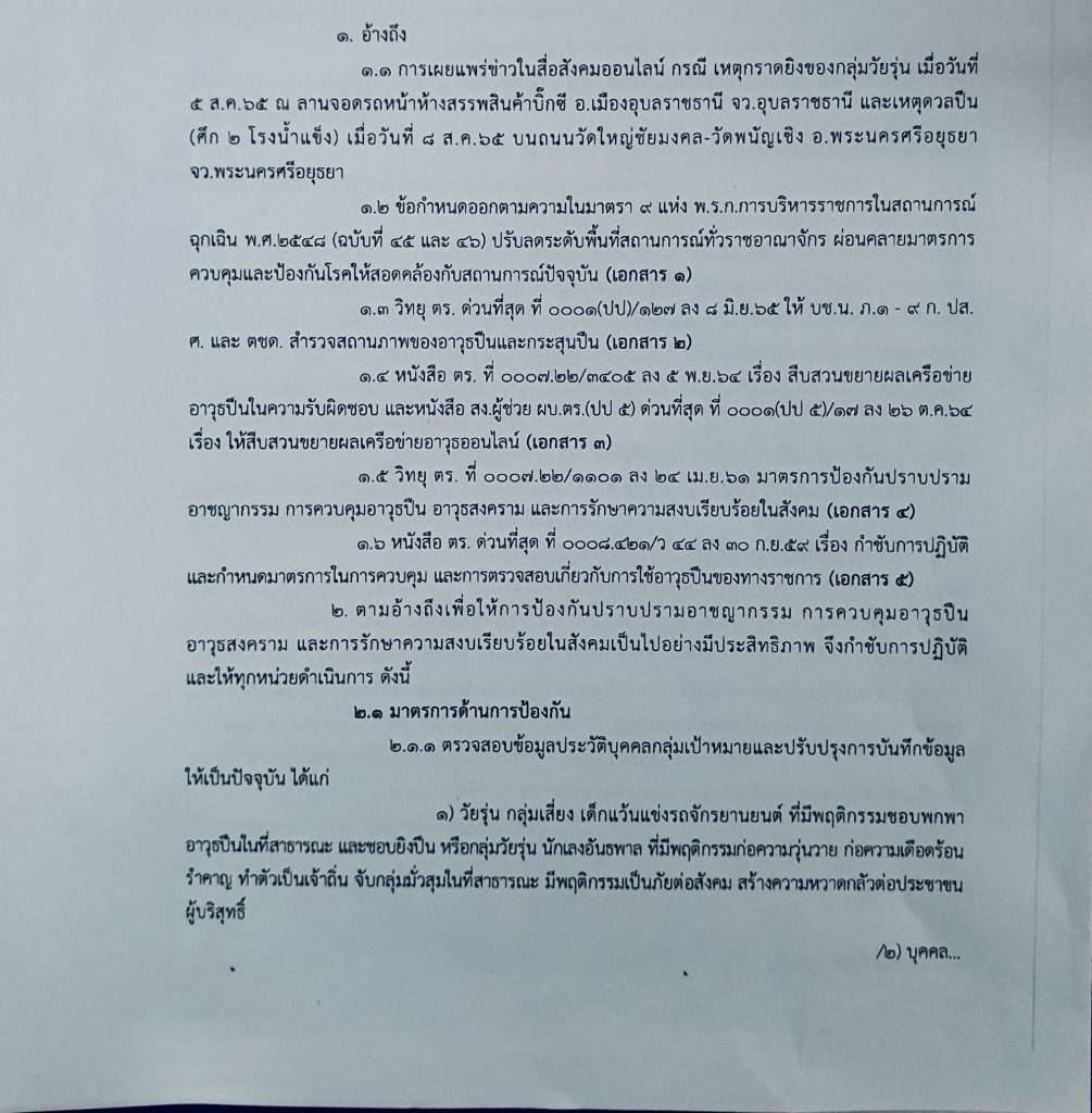 เมื่อวันที่ 24 ส.ค.2565 ที่สำนักงานตำรวจแห่งชาติ(ตร.) มีรายงานว่า พล.ต.ท.ต่อศักดิ์ สุขวิมล ผู้ช่วย ผบ.ตร. (ปป.5 ) ได้มีคำสั่งเป็นวิทยุราชการด่วน ถึง บช.น. ภ.1- 9 ก. ปส.ศ. และ ตชด. มีใจความระบุว่า จาก กรณี เหตุกราดยิงของกลุ่มวัยรุ่น เมื่อวันที่ 5 ส.ค.65 ที่ลานจอดรถหน้าห้างสรรพสินค้าบิ๊กซี อ.เมืองอุบลราชธานี จว.อุบลราชธานี และเหตุดวลปืนศึก 2 โรงน้ำแข็งเมื่อวันที่ 8 ส.ค.65 บนถนนวัดใหญ่ชัยมงคล-วัดพนัญเชิง อ.พระนครศรีอยุธยาจว.พระนครศรีอยุธยา รวมถึงเหตุการณ์อื่นๆ พร้อมทั้งข้อกำหนดออกตามความในมาตรา 9 แห่ง พ.ร.ก.การบริหารราชการในสถานการณ์ฉุกเฉิน พ.ศ.2548 (ฉบับที่ 45 และ 46 ) ปรับลดระดับพื้นที่สถานการณ์ทั่วราชอาณาจักร ผ่อนคลายมาตรการควบคุมและป้องกันโรคให้สอดคล้องกับสถานการณ์ปัจจุบัน รวมถึงวิทยุ ตร. ด่วนที่สุด ที่ 0001 (ปป)/127 ลง 8 มิ.ย.2565 ให้ บช.น. ภ.1- 9 ก. ปส. ศ. และ ตชด. สำรวจสถานภาพของอาวุธปืนและกระสุนปืน และ หนังสือ ตร. ที่ 0007 .22 /3405 ลง 5 พ.ย.64 เรื่อง สืบสวนขยายผลเครือข่ายอาวุธปืนในความรับผิดชอบ และหนังสือ สง.ผู้ช่วย ผบ.ตร.(ปป. 5 ) ด่วนที่สุด ที่ 0001 (ปป. 5 เรื่อง ให้สืบสวนขยายผลเครือข่ายอาวุธออนไลน์ มาตรการป้องกันปราบปรามอาชญากรรม การควบคุมอาวุธปืน อาวุธสงคราม และการรักษาความสงบเรียบร้อยในสังคม รวมถึง หนังสือ ตร. ด่วนที่สุด เรื่อง กำชับการปฏิบัติและกำหนดมาตรการในการควบคุม และการตรวจสอบเกี่ยวกับการใช้อาวุธปืนของทางราชการ ตามอ้างถึงเพื่อให้การป้องกันปราบปรามอาชญากรรม การควบคุมอาวุธปืนอาวุธสงคราม และการรักษาความสงบเรียบร้อยในสังคมเป็นไปอย่างมีประสิทธิภาพ จึงกำชับการปฏิบัติ และให้ทุกหน่วยดำเนินการ ตังนี้