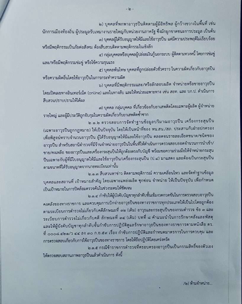 กลุ่มบุคคล หรือบุคคลผู้ปล่อยเงินกู้นอกระบบ ผู้ติดตามทวงหนี้โดยการข่มขู่หรือใช้ความรุนแรงกลุ่มผู้มีอิทธิพล นักเลงอันธพาล วัยรุ่นที่ประพฤติตนวุ่นวายในสังคมก่อความเดือดร้อนรำคาญ หรือมีพฤติการณ์ประทุษร้ายต่อทรัพย์ ชีวิต ร่างกายและเพศกรณีมีการจับกุมอาวุธปืน ให้ดำเนินการ ส่งกองพิสูจน์หลักฐานกลาง ตร. หรือ ศูนย์พิสูจน์หลักฐาน 1-10 ตรวจสอบและยิงเก็บปลอก หัวกระสุน เพื่อจัดเก็บเป็นฐานข้อมูลและตรวจพิสูจน์เปรียบเทียบกับคดีที่มีการใช้อาวุธปืนในการกระทำความผิด ให้สืบสวนขยายผลย้อนหลังเกี่ยวกับประวัติการครอบครอง แหล่งที่มาของอาวุธปืน ว่าเป็นของผู้มีพฤติการณ์เป็นผู้มีอิทธิพล มือปืนรับจ้าง หรือไม่ อย่างไร อาวุธปืนที่ถูกต้องตามกฎหมาย ให้เสนอขอเบิกถอนใบอนุญาตต่อนายทะเบียน