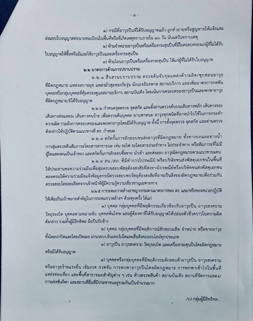 ห้ามจำหน่ายอาวุธปืนหรือเครื่องกระสุนปืนที่มีในครอบครองแก่ผู้ที่ไม่ได้รับใบอนุญาตให้ซื้อหรือมีและใช้อาวุธปืนและเครื่องกระสุนปีน -ห้ามโอนอาวุธปืนหรือเครื่องกระสุนปีน ให้แก่ผู้ที่ไม่ได้รับใบอนุญาต-มาตรการด้านการปราบปรามที่ผิดกฎหมาย แหล่งอบายมุข แหล่งมั่วสุมของวัยรุ่น นักเลงอันธพาล สถานบริการ และเพิ่มมาตรการกดดัน ให้สืบสวนปราบปราม ตรวจค้นจับกุมแหล่งค้า/ผลิต/ซุกซ่อนอาวุธบุคคลหรือกลุ่มบุคคลที่คุ้มครองดูแลสถานบริการ สถานบันเทิง โดยเน้นการครอบครองอาวุธปืนแลที่ผิดกฎหมาย มิได้รับอนุญาต
