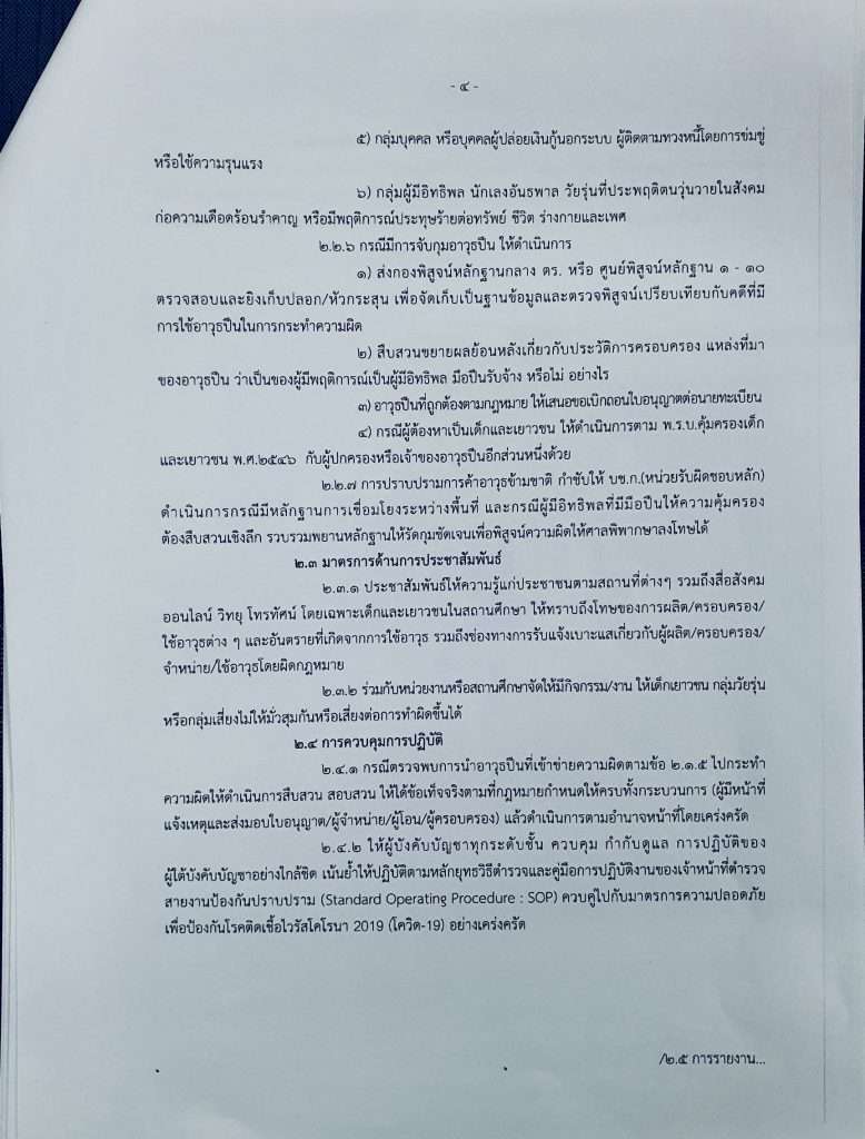 ในกรณีผู้ต้องหาเป็นเด็กและเยาวชน ให้ดำเนินการตาม พ.ร.บ.คุ้มครองเด็กและเยาวชน พ.ศ.2546 กับผู้ปกครองหรือเจ้าของอาวุธปืนอีกส่วนหนึ่งด้วยดำเนินการกรณีมีหลักฐานการเชื่อมโยงระหว่างพื้นที่ และกรณีผู้มีอิทธิพลที่มีมือปืนให้ความคุ้มครอง การปราบปรามการค้าอาวุธข้ามชาติ กำชับให้ บช.ก.หน่วยรับผิดชอบหลักต้องสืบสวนเชิงลีก รวบรวมพยานหลักฐานให้รัดกุมชัดเจนเพื่อพิสูจน์ความผิดให้ศาลพิพากษาลงโทษได้ให้มีมาตรการด้านการประชาสัมพันธ์ประชาสัมพันธ์ให้ความรู้แก่ประชาชนตามสถานที่ต่างๆ รวมถึงสื่อสังคมออนไลน์ วิทยุ โทรทัศน์ โดยเฉพาะเด็กและเยาวชนในสถานศึกษา ให้ทราบถึงโทษของการผลิต ครอบครองใช้อาวุธต่าง ๆ และอันตรายที่เกิดจากการใช้อาวุธ รวมถึงช่องทางการรับแจ้งเบาะแสเกี่ยวกับผู้ผลิต ครอบครอง จำหน่ายใช้อาวุธโดยผิดกฎหมาย ร่วมกับหน่วยงานหรือสถานศึกษาจัดให้มีกิจกรรมงาน ให้เด็กเยาวขน กลุ่มวัยรุ่นหรือกลุ่มเสี่ยงไม่ให้มั่วสุมกันหรือเสี่ยงต่อการทำผิดขึ้นได้