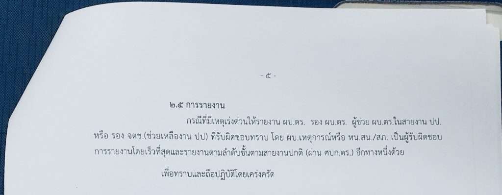 สำหรับการรายงานกรณีที่มีเหตุเร่งด่วนให้รายงาน ผบ.ตร. รอง ผบ.ตร. ผู้ช่วย ผบ.ตร.ในสายงาน ปป.หรือ รอง จตช (ช่วยงาน ปป) ที่รับผิดชอบทราบ โดย ผบ.เหตุการณ์หรือ หน.สน.สภ. เป็นผู้รับผิดชอบ การรายงานโดยเร็วที่สุดและรายงานตามลำดับชั้นตามสายงานปกติ (ผ่าน ศปก.ตร.) อีกทางหนึ่งด้วยเพื่อทราบและถือปฏิบัติโดยเคร่งครัด ใน”คำสั่งดังกล่าวระบุ”