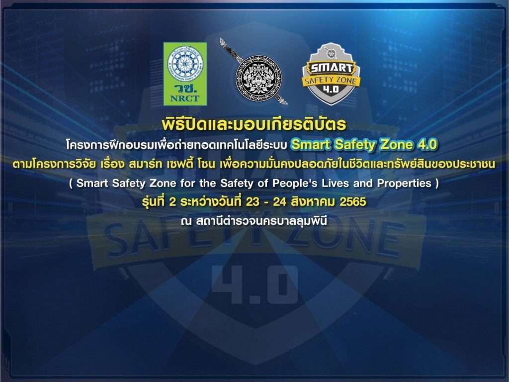 วันที่ 24 สิงหาคม 2565 เวลา 16.30 น. ณ สถานีตำรวจนครบาลลุมพินี พล.ต.ท.สุรเชษฐ์ หักพาล ผู้ช่วย ผบ.ตร. เป็นประธานในพิธีปิดฝึกอบรมการถ่ายทอดเทคโนโลยีระบบ Smart Safety Zone 4.0 ตามโครงการวิจัยเรื่อง สมาร์ท เซฟตี้ โซน เพื่อความมั่นคงปลอดภัยในชีวิตและทรัพย์สินของประชาชน (Smart Safety Zone for the Safety of People’s Lives and Properties) รุ่นที่ 2