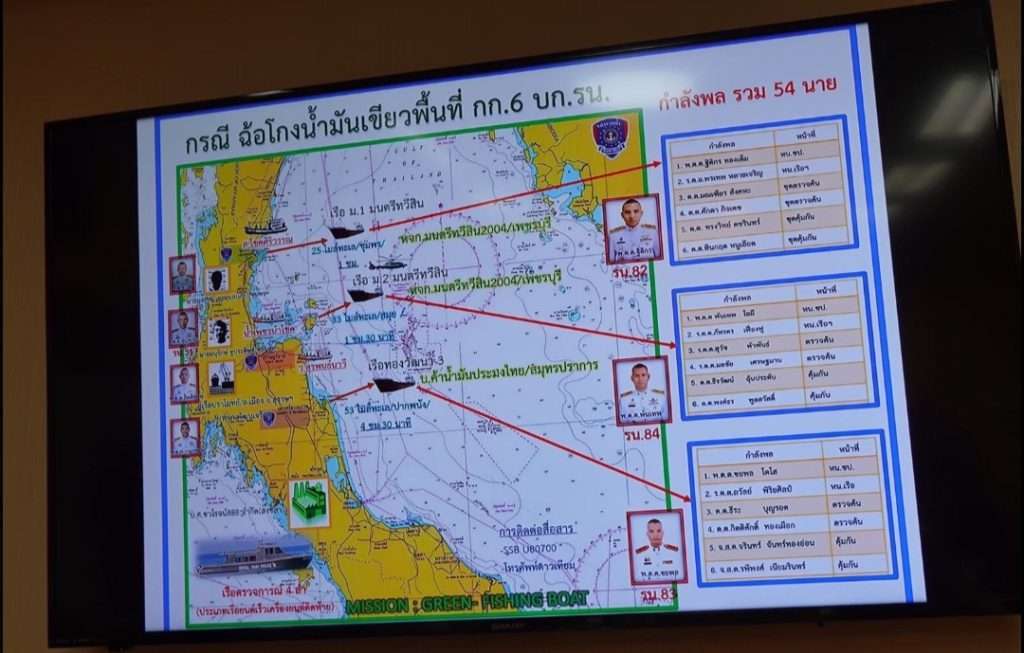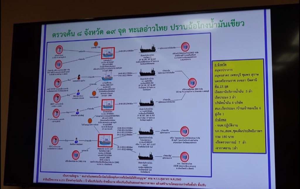 ตนได้สั่งการให้ตำรวจน้ำร่วมกับ กรมสรรพสามิต และกรมศุลกากร เข้าตรวจสอบปริมาณการรับน้ำมันทั้งระบบตั้งแต่ต้นทางจากโรงกลั่น ไปยังเรือขนส่งน้ำมัน และเรือสถานีบริการ (Tanker) ซึ่งในปี พ.ศ.2564 พบว่ามียอดปริมาณการรับน้ำมันจากต้นทางโรงกลั่น จำนวน 620 ล้านลิตรเช่นเดิม ซึ่งจากการตรวจสอบทั้งสามหน่วยงาน จึงทราบว่าปริมาณน้ำมันจากโรงกลั่น ไปยังเรือขนส่งน้ำมัน และส่งต่อไปที่เรือสถานีบริการ (Tanker) ครบถ้วนสมบูรณ์ แต่ตรวจสอบพบความผิดปกติจากเรือสถานีบริการ (Tanker) ไปยังเรือประมง ซึ่งพบว่ามีการลักลอบเติมน้ำมันเขียวนี้ไปยังเรือทุกประเภทรวมถึงเรือที่ไม่มีสิทธิเติมน้ำมันเขียว ขณะนี้อยู่ในระหว่างการตรวจสอบอย่างละเอียดอีกครั้งจากการตรวจสอบข้อมูลเรือประมงที่มีสิทธิเติมน้ำมันเขียว พบข้อมูลว่า มีเรือที่ไม่มีคุณสมบัติตามประกาศกรมศุลกากร แต่สมาคมการประมงแห่งประเทศไทย ออกรหัสและรับรองให้เติมน้ำมันเขียว ถึง 791 ลำ ประกอบด้วย เรือประมงพาณิชย์ไม่มีทะเบียนเรือ เรือประมงพาณิชย์ไม่มีใบอนุญาตประมงพาณิชย์จากกรมประมง เรือประมงพาณิชย์ที่แจ้งจมหรือทำลายไปแล้ว เรือประมงพาณิชย์ที่เปลี่ยนประเภทไปเป็นเรือบรรทุกสินค้า เรือลากจูง และเรือประมงพื้นบ้านที่มีขนาดถังน้ำมันตั้งแต่ 1,500 10,000 ลิตร