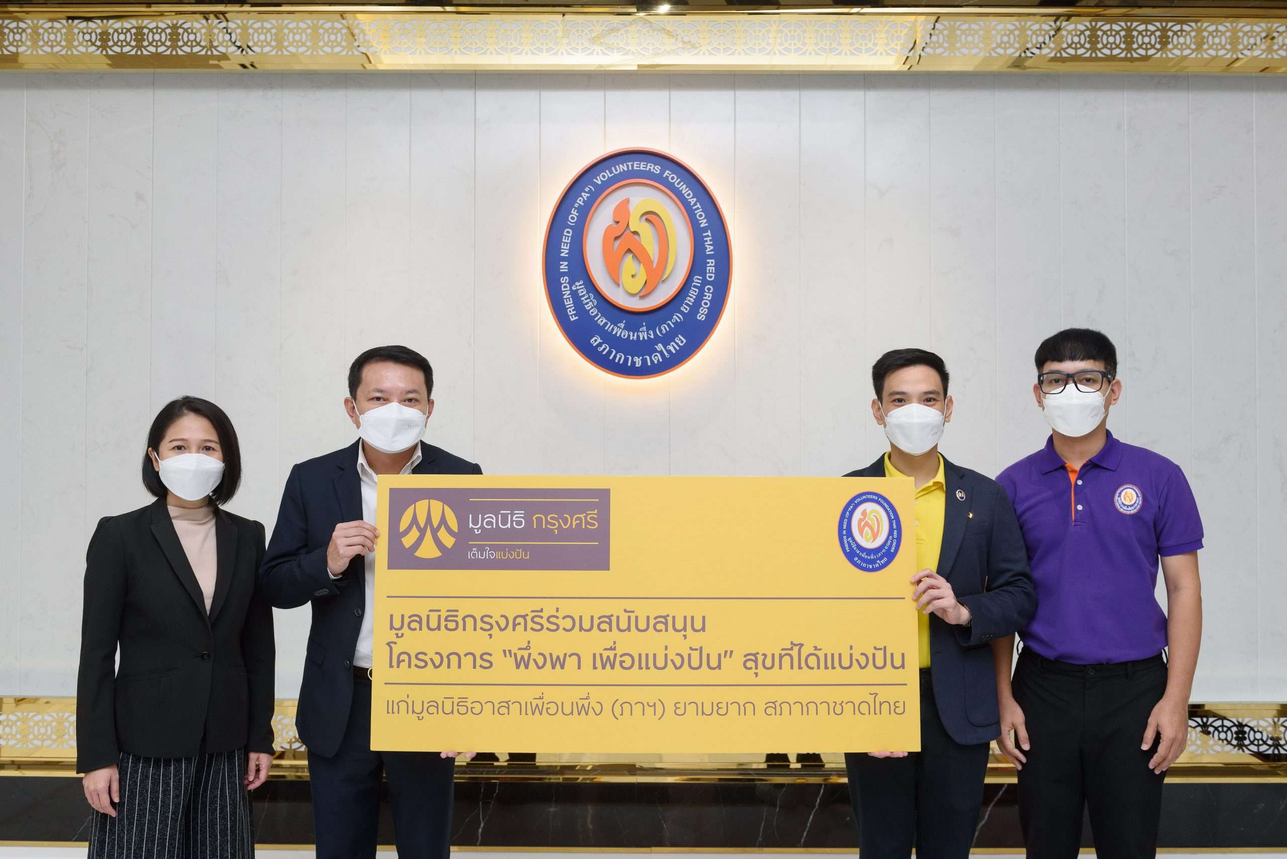 นายพูนสิทธิ์ ว่องธวัชชัย (ที่ 2 จากซ้าย) ผู้ช่วยเลขานุการ มูลนิธิกรุงศรี มอบเงินสมทบทุน 100,000 บาท แก่โครงการ “พึ่งพา เพื่อแบ่งปัน” สุขที่ได้แบ่งปัน ปีที่ 2 โดยมี นายฐิติวัฒน์ ว่องวรรณกุล (ที่ 2 จากขวา) กรรมการและผู้จัดการ มูลนิธิอาสาเพื่อนพึ่ง (ภาฯ) ยามยาก สภากาชาดไทย เป็นผู้แทนรับมอบ เพื่อนำไปสนับสนุนภารกิจด้านการบริหารจัดการเพื่อเฝ้าระวังและบรรเทาภัยพิบัติน้ำท่วมที่จะเกิดขึ้นต่อชุมชน ตลอดจนเตรียมความพร้อมรับมือกับอุทกภัยได้อย่างมีประสิทธิภาพ พิธีรับมอบจัดขึ้น ณ มูลนิธิอาสาเพื่อนพึ่ง (ภาฯ) ยามยาก สภากาชาดไทย
