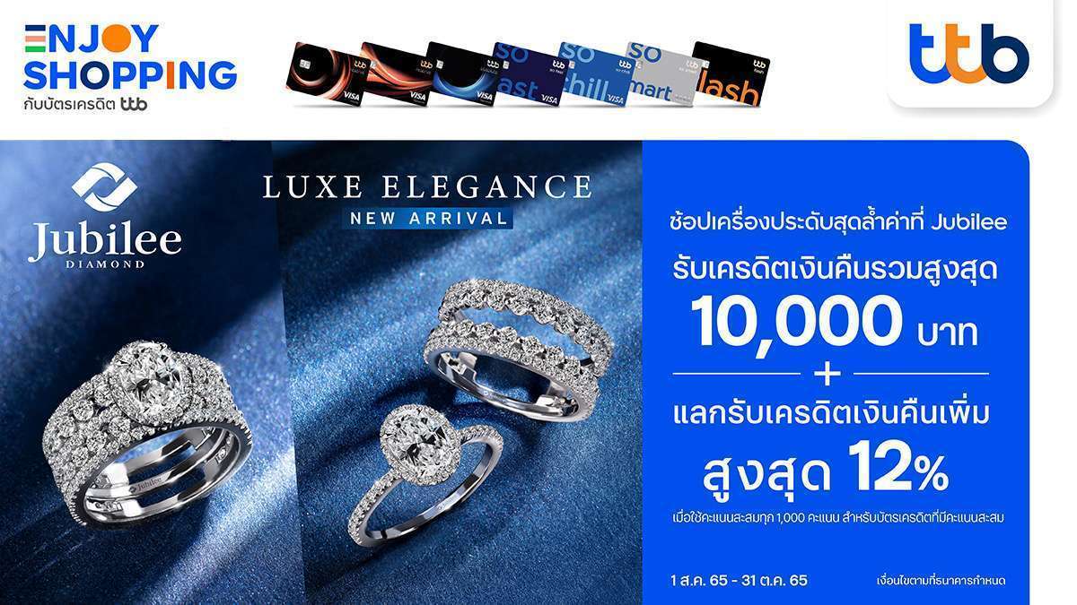 บัตรเครดิต ทีทีบี มอบสิทธิพิเศษสำหรับผู้ถือบัตรเครดิต ทีทีบี บัตรเครดิต ทีเอ็มบี บัตรเครดิต ธนชาต และบัตรกดเงินสด ทีทีบี แฟลช ในแคมเปญ “ช้อปเครื่องประดับสุดล้ำค่าที่ Jubilee” เมื่อทำรายการชำระเต็มจำนวน หรือแบ่งชำระ 0% นานสูงสุด 10 เดือน (เฉพาะสินค้าที่ร่วมรายการ) ที่ร้าน Jubilee