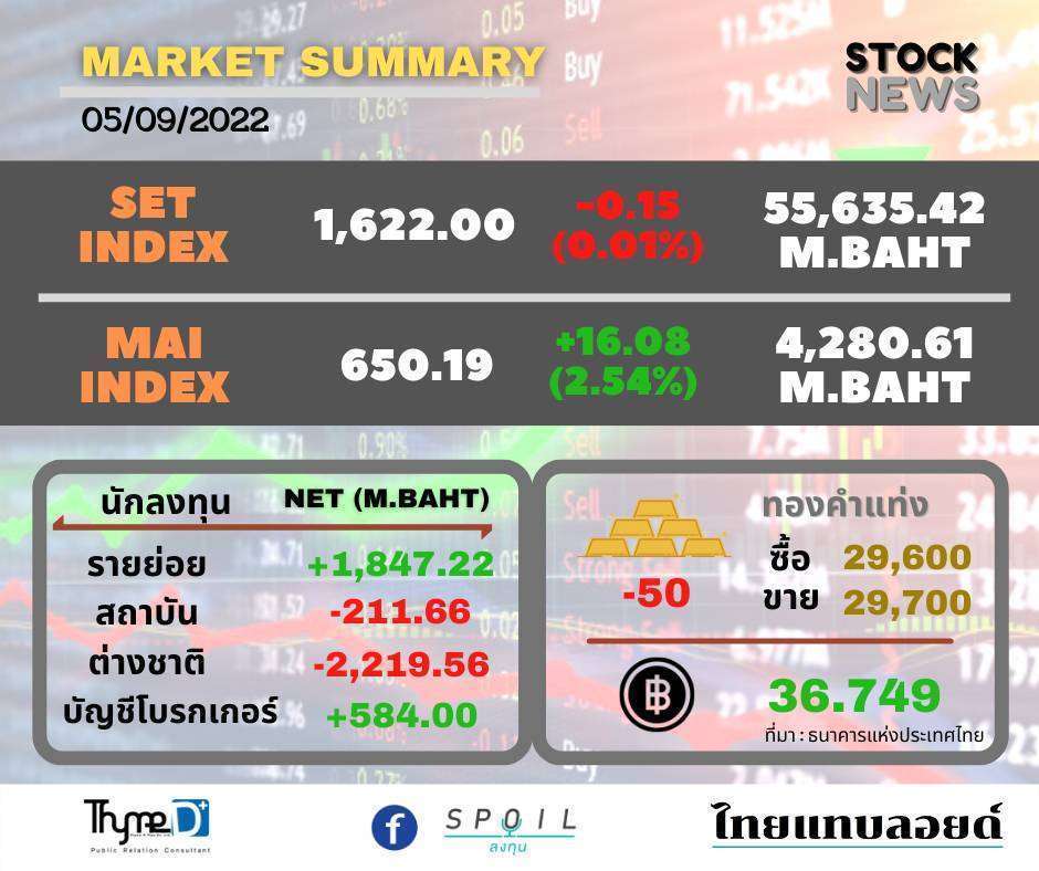 ตลาดหลักทรัพย์ ปิดวันนี้ที่ระดับ 1,622.00 จุด ลดลง 0.15 จุด (-0.01%) มูลค่าการซื้อขาย 55,635.42 ล้านบาท