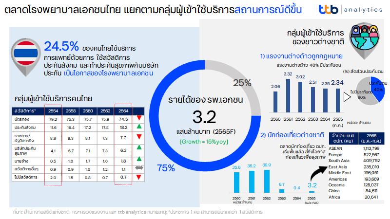 ttb analytics แนะธุรกิจโรงพยาบาลเอกชนพุ่งเป้าไปที่ตลาดในประเทศ กลุ่มผู้มีประกันสังคม กลุ่มผู้ทำประกันสุขภาพ ในพื้นที่ EEC และตลาดต่างประเทศ กลุ่ม Medical Tourism จากข้อมูลสถิติโครงสร้างการใช้สวัสดิการทางการแพทย์ของคนไทย พบว่าในช่วงกว่า 1 ทศวรรษที่ผ่านมา (2554-2564) แนวโน้มคนไทยใช้บริการการแพทย์ด้วยการใช้สวัสดิการประกันสังคมและทำประกันสุขภาพกับบริษัทประกันเพิ่มขึ้นอย่างต่อเนื่อง โดยในปี 2564 สัดส่วนการใช้สวัสดิการประกันสังคมและทำประกันสุขภาพรวมกันมากถึง 24.5% ของการใช้สวัสดิการทางการแพทย์รวม โดยเพิ่มขึ้นจาก 15.7% ในปี 2554 ชี้ถึงดีมานด์ความต้องการใช้บริการทางการแพทย์ที่มากขึ้นจากแรงงานที่อยู่ในระบบประกันสังคมกว่า 11 ล้านคน และประชาชนที่ยินดีจ่ายประกันสุขภาพเพื่อความคุ้มครองจากการเจ็บป่วย