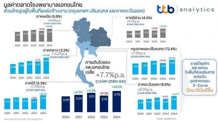 ttb analytics คาดว่าปี 2565 รายได้ของธุรกิจโรงพยาบาลเอกชนไทยจะเติบโต 15% จากปี 2564 โดยมูลค่าตลาดจะอยู่ที่ 3.2 แสนล้านบาท โดยได้รับผลดีจากความต้องการทั้งตลาดคนไทย และชาวต่างชาติ