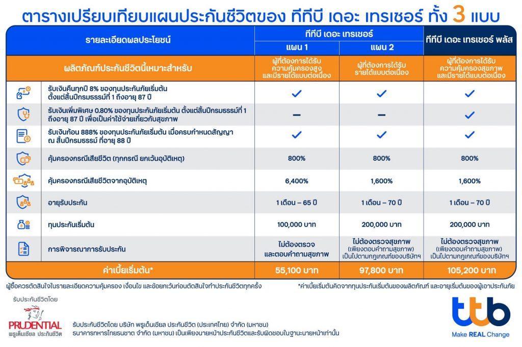 นายชวมนต์ วินิจตรงจิตร รองประธานเจ้าหน้าที่บริหาร หัวหน้าบริหารผลิตภัณฑ์พันธมิตรทางธุรกิจกลุ่มลูกค้าบุคคล ทีเอ็มบีธนชาต หรือ ทีทีบี เปิดเผยว่า ธนาคารมุ่งตอบโจทย์ความต้องการและความมั่นคงเพื่อสร้างชีวิตทางการเงินของลูกค้าให้ดีขึ้น หลังจากร่วมมือกับ พรูเด็นเชียล ประเทศไทย พัฒนา ประกันชีวิต ทีทีบี เดอะ เทรเชอร์ พลัส ด้วยแผนออมเงินในรูปแบบประกันชีวิตที่เหมาะสำหรับลูกค้าที่ต้องการสร้างเงินเก็บสะสมในระยะยาว พร้อมมีเงินสํารองเพื่อการรักษาพยาบาลให้กับครอบครัว หรือกลุ่มลูกค้าอายุน้อย ที่มีสถานภาพโสดที่ต้องการสร้างเงินเก็บพร้อมสวัสดิการค่ารักษาพยาบาลไว้ใช้ในวัยเกษียณ โดยมีทั้งความคุ้มครองจากกรมธรรม์ประกันชีวิตและมีเงินออมอยู่ในบัญชีเดียวกัน ไม่ต้องแยกเก็บบัญชีไว้เพื่อออมเงิน โดยลูกค้าที่ซื้อผลิตภัณฑ์ ทีทีบี เดอะ เทรเชอร์ พลัส จะได้รับสิทธิประโยชน์ ดังนี้
