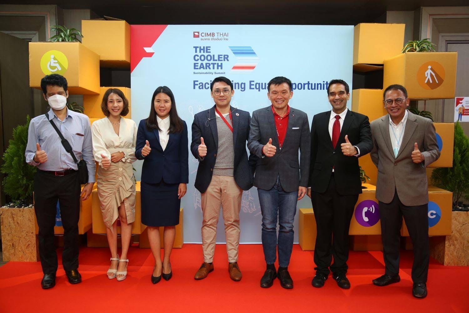 คุณพอล วอง ชี คิน กรรมการผู้จัดการใหญ่และประธานเจ้าหน้าที่บริหาร คุณประภาส ทองสุข รองกรรมการผู้จัดการใหญ่ สื่อสารององค์กร ดร.อมรเทพ จาวะลา ผู้ช่วยกรรมการผู้จัดการใหญ่ ผู้บริหารสำนักวิจัย และที่ปรึกษาการลงทุน คุณเจสัน ลี ผู้บริหาร Sustainability ธนาคาร ซีไอเอ็มบี ไทย พร้อมด้วยคุณพัชรมณฑ์ ปิติปัญญากุล ผู้อำนวยการกองส่งเสริมสิทธิและสวัสดิการคนพิการ กรมส่งเสริมและพัฒนาคุณภาพชีวิตคนพิการ คุณเมธาวี ทัศนาเสถียรกิจ ผู้ก่อตั้ง บริษัท Vulcan Coalition สตาร์ทอัพ เอไอ ช่วยเหลือผู้พิการทางสายตา และ คุณกิติพงศ์ สุทธิ ผู้อำนวยการห้องสมุดคนตาบอดและผู้พิการทางสื่อสิ่งพิมพ์แห่งชาติ มูลนิธิคนตาบอดไทย ร่วมงานเสวนา The Cooler Earth: Sustainability Summit 2022ภายใต้หัวข้อ “Facilitating Equal Opportunity”: สนับสนุนการเปลี่ยนผ่านสู่สังคมที่เท่าเทียมอย่างยั่งยืน เพื่อให้เกิดการตื่นตัวในสังคมเกี่ยวกับการรักษาสมดุลของสภาวะแวดล้อมบนโลกของเรา ควบคู่ไปกับการรณรงค์ในเรื่อง ความเท่าเทียมทางสังคมของผู้พิการ ซึ่งภายงานเสวนาได้มีการร่วมแสดงทรรศนะและแลกเปลี่ยนความคิดเห็น เพื่อส่งเสริมความรู้ความเข้าใจให้แก่ภาคสังคม และผลักดันให้เกิดการขับเคลื่อนต่อไป