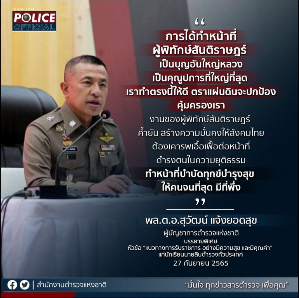 เมื่อเวลา 14.00 น วันที่ 27 กันยายน 2565 ที่ศูนย์ฝึกอบรมตำรวจภูธรภาค 1 ( ศฝร.ภ.1 ) อ.เมือง จว.สระบุรี พล.ต.อ.สุวัฒน์ แจ้งยอดสุข ผู้บัญชาการตำรวจแห่งชาติ ( ผบ.ตร.) บรรยายพิเศษ ในหัวข้อ “แนวทางการรับราชการ อย่างมีความสุข และมีคุณค่า” โดยมี พล.ต.ท.กิตติ์รัฐ พันธุ์เพ็ชร ผู้ช่วย ผบ.ตร. พล.ต.ท.จิรพัฒน์ ภูมิจิตร ผู้บัญชาการตำรวจภูธรภาค1 ข้าราชการตำรวจในสังกัดตำรวจภูธรภาค 1, ศฝร.ภ.1 และนักเรียนนายสิบตำรวจ ( นสต. ) ทั่วประเทศ รับฟังผ่านระบบออนไลน์