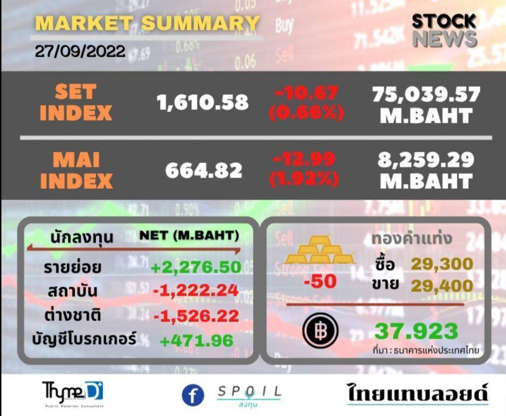 ตลาดหลักทรัพย์ ปิดวันนี้ที่ระดับ 1,610.58 จุด ลดลง 10.67 จุด (-0.66%) มูลค่าการซื้อขาย 75,039.57 ล้านบาท