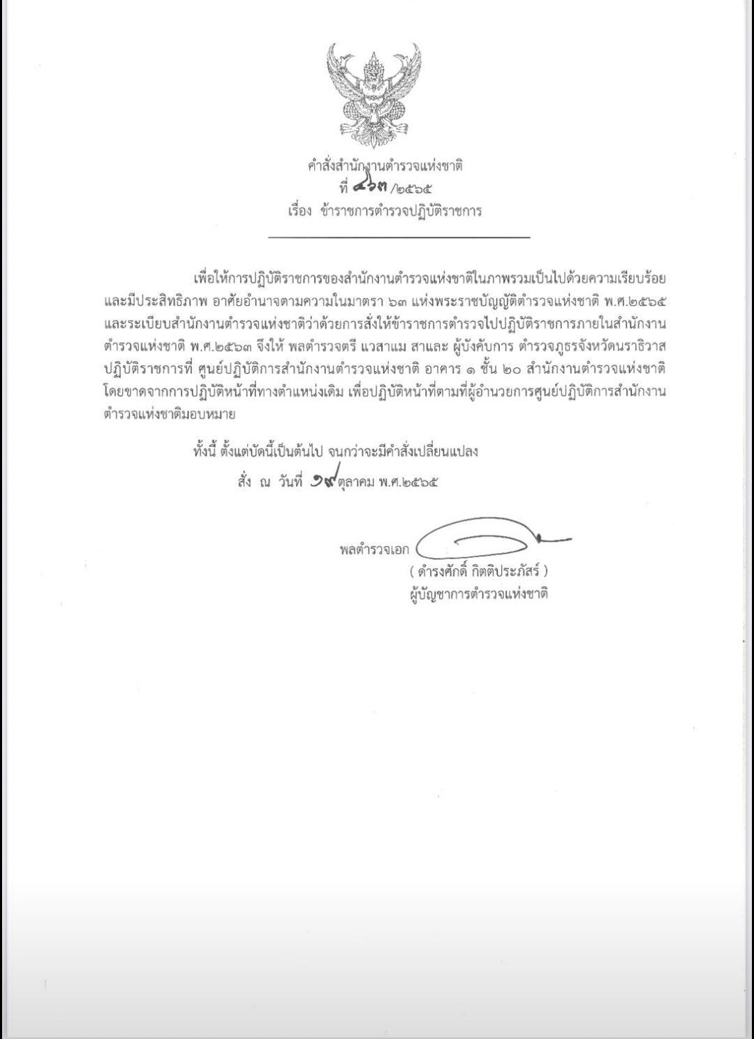 เมื่อวันที่ 20 ตุลาคม 2565 ที่สำนักงานตำรวจแห่งชาติ (ตร.) พล.ต.อ.ดำรงศักดิ์ กิตติประภัสร์ ผู้บัญชาการตำรวจแห่งชาติ (ผบ.ตร.) มีหนังสือคำสั่งตร. เลขที่ 463/2565 ลงวันที่ 19 ต.ค. เรื่อง ข้าราชการตำรวจปฏิบัติราชการ ใจความว่า เพื่อให้การปฏิบัติราชการของสำนักงานตำรวจแห่งชาติในภาพรวมเป็นไปด้วยความเรียบร้อย และมีประสิทธิภาพ อาศัยอำนาจตามความในมาตรา 63 แห่งพระราชบัญญัติตำรวจแห่งชาติ พ.ศ.2565 และระเบียบสำนักงานตำรวจแห่งชาติว่าด้วยการสั่งให้ข้าราชการตำรวจไปปฏิบัติราชการภายในสำนักงานตำรวจแห่งชาติ พ.ศ.2563 จึงให้ พล.ต.ต.แวสาแม สาและ ผู้บังคับการตำรวจภูธรจังหวัดนราธิวาส ปฏิบัติราชการที่ศูนย์ปฏิบัติการสำนักงานตำรวจแห่งชาติ อาคาร 1 ชั้น 20 สำนักงานตำรวจแห่งชาติ โดยขาดจากการปฏิบัติหน้าที่ทางตำแหน่งเดิม เพื่อปฏิบัติหน้าที่ตามที่ผู้อำนวยการศูนย์ปฏิบัติการสำนักงานตำรวจแห่งชาติมอบหมาย ทั้งนี้ ตั้งแต่บัดนี้เป็นต้นไป จนกว่าจะมีคำสั่งเปลี่ยนแปลง