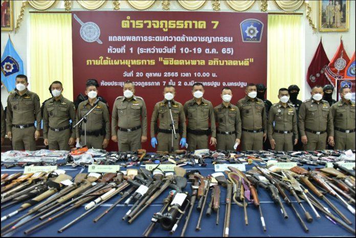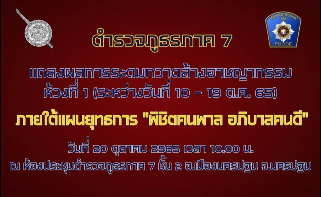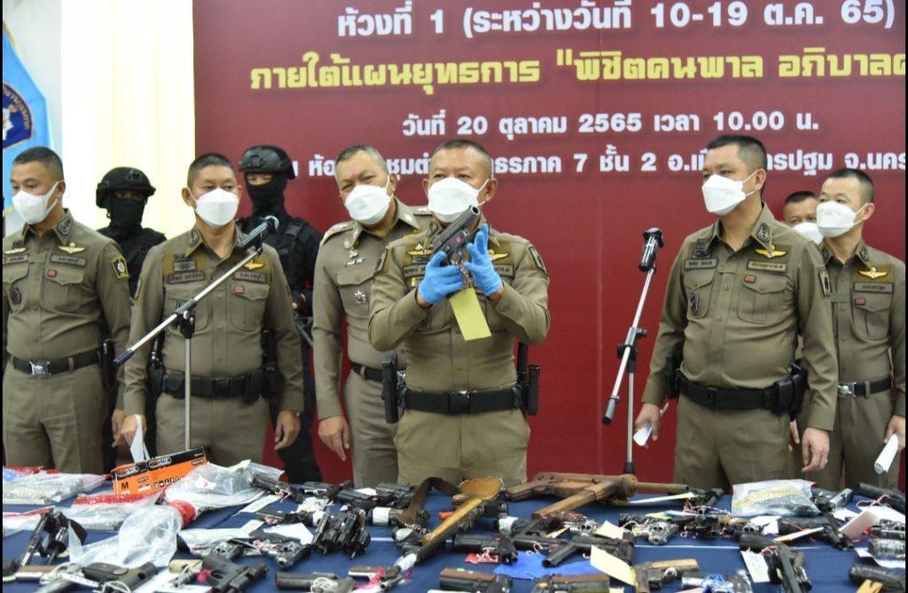 วันที่ 20 ตุลาคม 2565 ที่ บช.ภ.7 อ.เมืองนครปฐม จ.นครปฐม พล.ต.ท.ธนายุตม์ วุฒิจรัสธำรงค์ ผบช.ภ.7 ไดัแถลงว่า เนื่องด้วยปัจจุบันมีการก่ออาชญากรรมสะเทือนขวัญที่มีการใช้อาวุธปืนในการกระทำความผิดอยู่บ่อยครั้ง สร้างความสูญเสียแก่ชีวิต ทรัพย์สิน และความหวาดกลัวภัยของประชาชนมากยิ่งขึ้น ส่งผลกระทบต่อสังคม และความสงบเรียบร้อยของประชาชนโดยรวม พลเอก ประยุทธ์ จันทร์โอชา นายกรัฐมนตรี และพลเอก ประวิตร วงษ์สุวรรณ รองนายกรัฐมนตรี ฝ่ายความมั่นคงซึ่งมีความห่วงใยพี่น้องประชาชน จึงบัญชาให้สำนักงานตำรวจแห่งชาติเร่งรัดปราบปรามอาชญากรรมนั้น