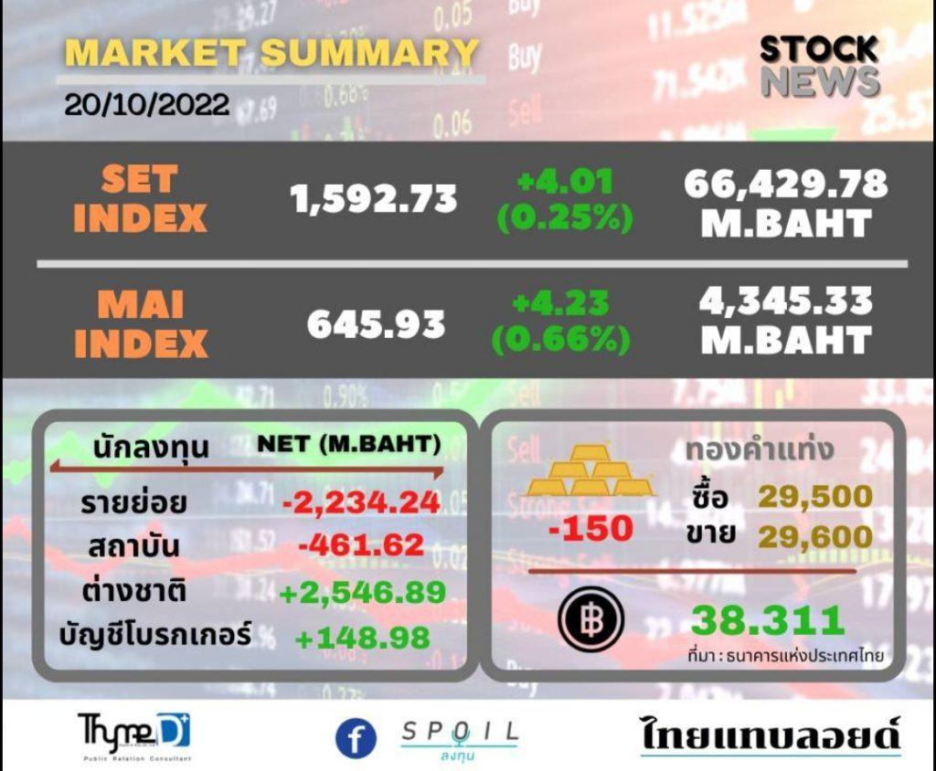 ตลาดหลักทรัพย์ ปิดวันนี้ที่ระดับ 1,592.73 จุด เพิ่มขึ้น 4.01 จุด (+0.25%) มูลค่าการซื้อขาย 66,429.13 ล้านบาท