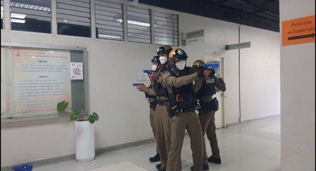 วันที่ 20 ตุลาคม 2565 เวลา 13.00 น. ที่ โรงเรียนสาธิตจุฬาลงกรณ์ แผนกมัธยม พล.ต.อ.ต่อศักดิ์ สุขวิมล รอง ผบ.ตร., พล.ต.ท.สำราญ นวลมา ผู้ช่วย ผบ.ตร. เดินทางไปรับชมการฝึกวิธีเอาตัวรอดในสถานการณ์ฉุกเฉิน ( กราดยิง ) โดยมีการฝึกอบรมเพื่อเตรียมความพร้อมเผชิญเหตุกรณีคนร้ายยิงกราด Active shooter นั้นได้แบ่งเป็น สองส่วนคือการอบรมภาคทฤษฎี โดยเจ้าหน้าที่ตำรวจ และการฝึกอบรมภาคปฏิบัติซึ่วแบ่งเป็น 3 ฐาน และจะแบ่งบุคลากรในการฝึกซ้อม 3 กลุ่มซึ่งมีทั้งนักเรียน ครู และบุคลากรอื่นๆให้ฝึกซ้อมร่วมกัน โดยจะสลับหมุนเวียนกันไปในแต่ละฐาน ได้แก่ ฐานที่ 1 การหนี ซ่อน สู้ ซึ่งจะมีการสาธิตเหตุการณ์จริงว่าเมื่อมีคนร้ายก่อเหตุยิงกราดจะมีวิธีการในการเอาตัวรอดอย่างไร ฐานที่ 2 การปฐมพยาบาลเบื้องต้น เพื่อสร้างความรู้เบื้องต้นในการรักษาบาดแผลและให้ความช่วยเหลือผู้ประสบเหตุร้าย เพื่อลดการสูญเสีย และฐานที่ 3 คือการปฏิบัติเพื่อพบ IED ระเบิด ทำให้รู้ว่าเมื่อพบวัตถุเข้าข่ายที่จะเป็นระเบิดควรปฏิบัติตัวอย่างไร