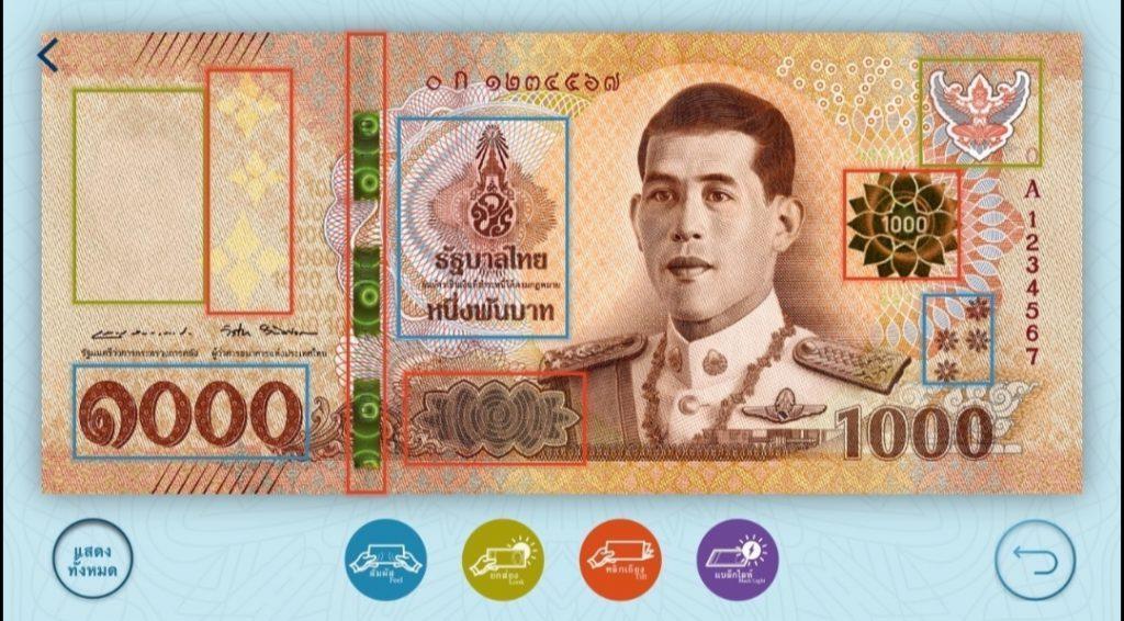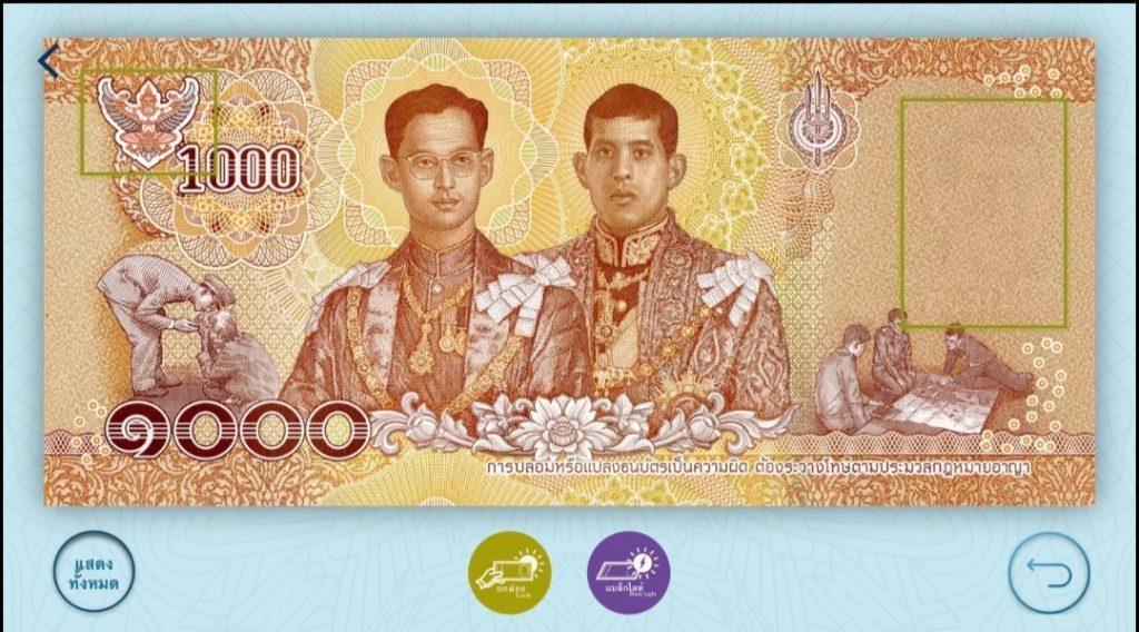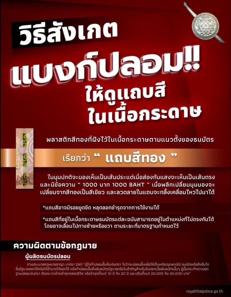 สำหรับวิธีสังเกตในเบื้องต้นธนบัตรใบละ 1,000 บาท ว่าปลอมหรือไม่ ให้ดูที่ “แถบสีในเนื้อกระดาษ” ดังนี้ เป็นพลาสติกสีทองที่ฝังไว้ในเนื้อกระดาษตามแนวตั้ง ของธนบัตร จึงเรียกว่า “แถบสีทอง”, ในมุมปกติจะมองเห็นเป็นเส้นประแต่เมื่อส่องกับแสงจะเห็นเป็นเส้นตรงและมีข้อความ “1000 บาท 1000 BAHT” เมื่อพลิกเปลี่ยนมุมมองจะเปลี่ยนจากสีทองเป็นสีเขียว และลวดลายในแถบจะกลิ้งเคลื่อนไหวไปมาได้แถบสีอาจมีรอยขูดขีด หลุดลอกชำรุดจากการใช้งานได้ แถบสีที่อยู่ในเนื้อกระดาษธนบัตรแต่ละฉบับสามารถอยู่ในตำแหน่งที่ไม่ตรงกันได้ โดยอาจเลื่อนไปทางซ้ายหรือขวา ตามระยะที่มาตรฐานกำหนดไว้ โดยโทษฐานปลอมหรือแปลงธนบัตร ประมวลกฎหมายอาญา มาตรา 240 ระบุไว้ว่า ผู้ใดทำปลอมขึ้นซึ่งเงินตรา ไม่ว่าจะปลอมขึ้นเพื่อให้เป็นเหรียญกษาปณ์ ธนบัตรหรือสิ่งอื่นใด ซึ่งรัฐบาลออกใช้หรือให้อำนาจให้ออกใช้ หรือทำปลอมขึ้นซึ่งพันธบัตรรัฐบาลหรือใบสำคัญสำหรับรับดอกเบี้ยพันธบัตรนั้นๆ ผู้นั้นกระทำความผิดฐานปลอมเงินตรา ต้องระวางโทษจำคุกตลอดชีวิต หรือจำคุกตั้งแต่ 10 ปี ถึง 20 ปี และปรับตั้งแต่ 20,000 ถึง 40,000 บาท