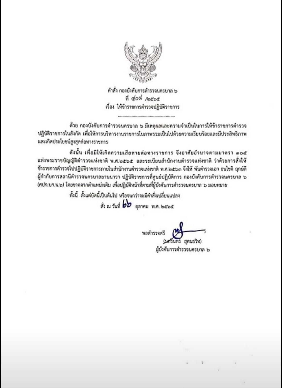 วันที่ 26 ต.ค.2565 ที่ ตร. พล.ต.ต.นครินทร์ สุคนธวิท ผู้บังคับการคำรวจนครบาล 6 มีหนังสือคำสั่งที่ 408/2565 ให้ พ.ต.อ.ธนโชติ ฤกษ์ที ผู้กำกับการสถานีตำรวจนครบาลยานนาวา ปฏิบัติราชการที่ศูนย์ปฏิบัติการ กองบังคับการตำรวจนครบาล 6 หรือ ศปก.บก.น.6 โดยขาดจากตำแหน่งเดิม เพื่อปฏิบัติหน้าที่ตามที่ผู้บังคับการตำรวจนครบาล 6 มอบหมาย ทั้งนี้ ตั้งแต่บัดนี้เป็นต้นไป หรือจนกว่าจะมีคำสั่งเปลี่ยนแปลง