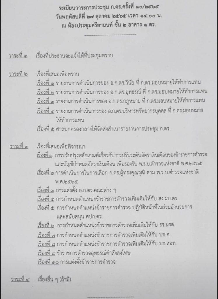 การกำหนดตำแหน่งข้าราชการตำรวจเพิ่มเติมให้กับ สง.ผบ.ตร., การกำหนดตำแหน่งข้าราชการตำรวจ ปฏิบัติหน้าที่ในส่วนอำนวยการและสนับสนุน ศปก.ตร.รวมถึงการกำหนดตำแหน่งข้าราชการตำรวจเพิ่มเติมให้กับ รร.นรต., การกำหนดตำแหน่งข้าราชการตำรวจเพิ่มเติมให้กับ บช.ศ., การกำหนดตำแหน่งข้าราชการตำรวจเพิ่มเติมให้กับ บช.สอท., ข้าราชการตำรวจอุทธรณ์คำสั่งลงโทษ และการแต่งตั้งข้าราชการตำรวจ และวาระสุดท้ายวาระที่ 4 เรื่องอื่น ๆ (ถ้ามี)