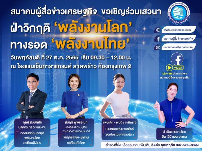 สมาคมผู้สื่อข่าวเศรษฐกิจ ขอเรียนเชิญบุคคลทั่วไปเข้าร่วมฟังเสวนาหาทางออก ฝ่าวิกฤติ “พลังงานโลก” ทางรอด “พลังงานไทย” วันพฤหัสบดีที่ 27 ตุลาคม 2565 เวลา 09.30 – 12.00 น. ณ ห้องประชุมกรุงเทพ 2 โรงแรมเซ็นทารา แกรนด์ แอท เซ็นทรัลพลาซา ลาดพร้าว