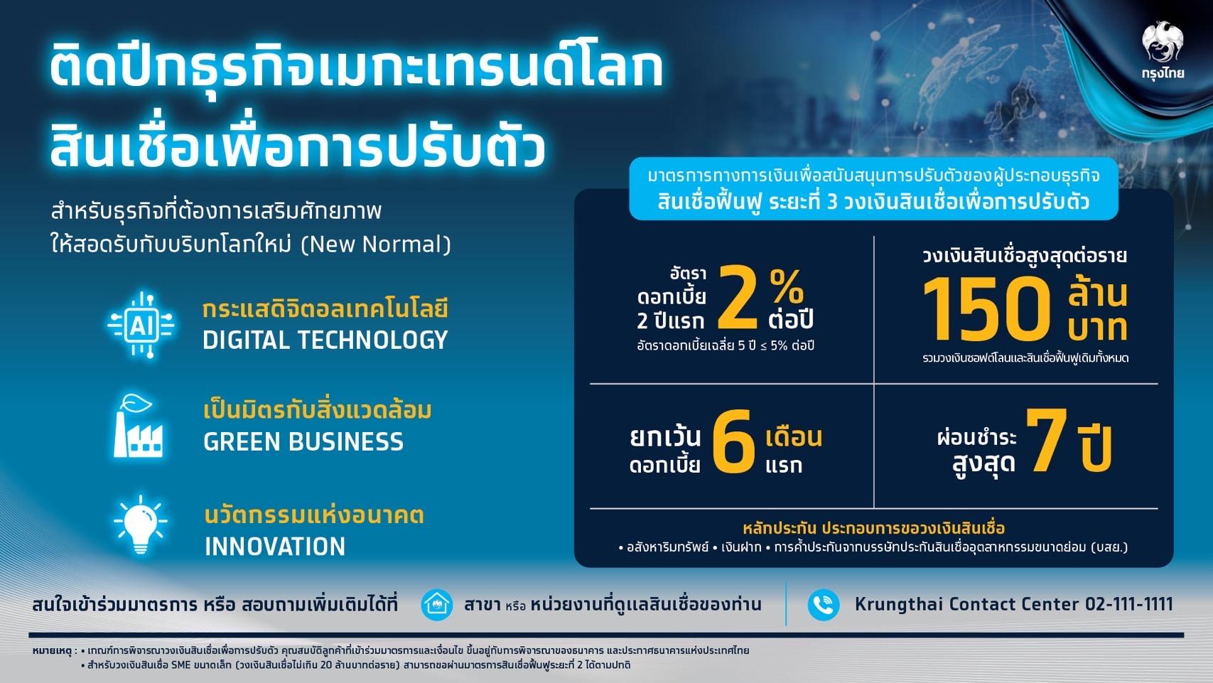 ธนาคารกรุงไทย ในฐานะธนาคารพาณิชย์ชั้นนำของประเทศ ขับเคลื่อนองค์กรด้วยนวัตกรรมและเทคโนโลยี เพื่อตอบโจทย์ความต้องการลูกค้าทุกกลุ่มในทุกมิติ ให้ความสำคัญกับการดูแลสิ่งแวดล้อม สังคม และธรรมาภิบาล (ESG) สนับสนุนการปรับตัวของภาคธุรกิจ โดยเฉพาะผู้ประกอบธุรกิจขนาดกลางและขนาดย่อม (SMEs) ซึ่งเป็นรากฐานสำคัญของเศรษฐกิจไทย พร้อมติดปีกธุรกิจเมกะเทรนด์โลก ด้วย มาตรการสินเชื่อฟื้นฟูระยะที่ 3 วงเงินสินเชื่อเพื่อการปรับตัว หรือ สินเชื่อฟื้นฟูเพื่อการปรับตัว สนับสนุนวงเงินสำหรับการปรับปรุง การพัฒนา หรือเสริมศักยภาพธุรกิจให้สอดรับกับบริบทโลกใหม่ (New Normal) ใน 3 รูปแบบ คือ กระแสเทคโนโลยีดิจิทัล (Digital) การดำเนินธุรกิจที่เป็นมิตรกับสิ่งแวดล้อม (Green) และนวัตกรรมแห่งโลกอนาคต (Innovation) ซึ่งเป็นเมกะเทรนด์ธุรกิจของโลก