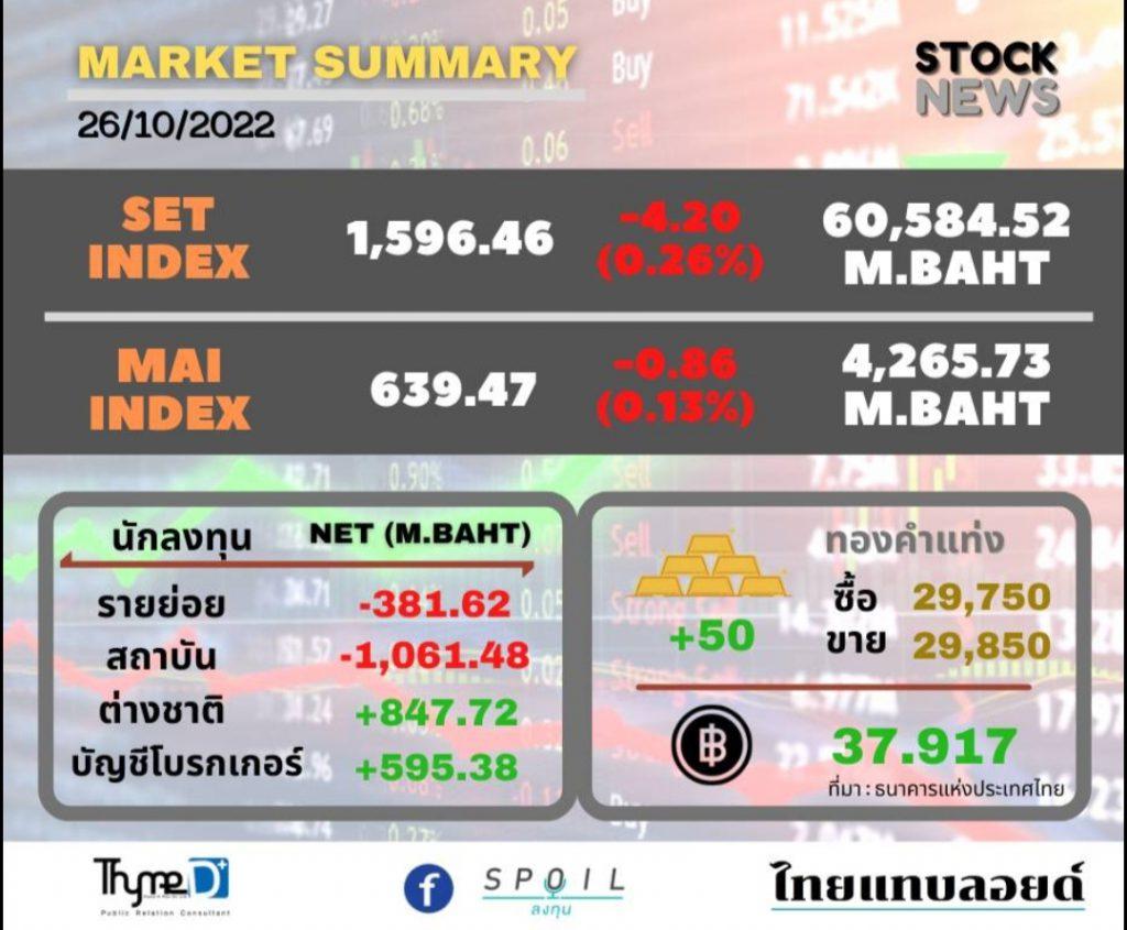 ตลาดหลักทรัพย์ ปิดวันนี้ที่ระดับ 1,596.46 จุด ลดลง 4.20 จุด (-0.26%) มูลค่าการซื้อขาย 60,584.52 ล้านบาท
