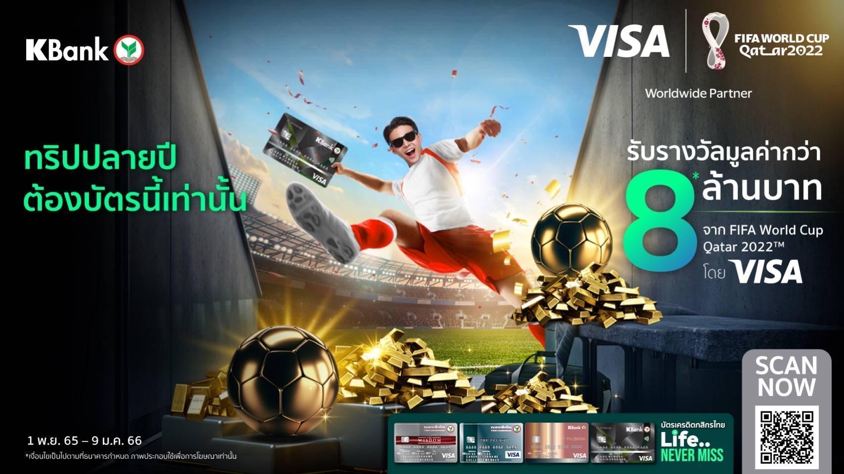 นางสาวอรธิดา บุญเปี่ยมศักดิ์ (ซ้าย) ผู้ช่วยกรรมการผู้จัดการ ธนาคารกสิกรไทย และ นางสาวพิภาวิน สดประเสริฐ (ขวา) ผู้จัดการวีซ่า ประจำประเทศไทย บริษัท วีซ่า อินเตอร์เนชั่นแนล (ประเทศไทย) ร่วมจัดแคมเปญ FIFA World Cup Qatar 2022™ โดย VISA ต้อนรับมหกรรมลูกหนังระดับโลกร่วมด้วยเทศกาลท่องเที่ยวต่างประเทศช่วงปลายปี โดยลูกค้าที่เดินทางไปต่างประเทศและใช้จ่ายผ่านบัตรเครดิตวีซ่ากสิกรไทยทุกประเภท เป็นสกุลเงินต่างประเทศ (ทั้งร้านค้าในต่างประเทศและร้านค้าออนไลน์) ยกเว้น บัตรเครดิตเพื่อธุรกิจ บัตรเครดิตนิติบุคคลทุกประเภท บัตรเครดิต LINE POINTS Credit Card เป็นต้น มีสิทธิ์ลุ้นได้เฮสนั่นรับโชคใหญ่เป็นลูกฟุตบอลทองคำและทองคำรวมมูลค่ากว่า 5 ล้านบาท และพิเศษ! รับคะแนนสะสม K Point สูงสุด 8,000 คะแนน ส่วนลูกค้าช้อปกระหน่ำและมียอดใช้จ่ายสูงสุด 5 ท่านแรก ได้รางวัลสุดยอดนักช้อป (Top Spender) พร้อมรับแพ็กเกจตั๋วเครื่องบินไป-กลับเกาะมัลดีฟ และที่พัก Anantara Kihavah 4 วัน 3 คืน (มูลค่ารางวัลละ 6 แสนบาท) รวมมูลค่า 3 ล้านบาท