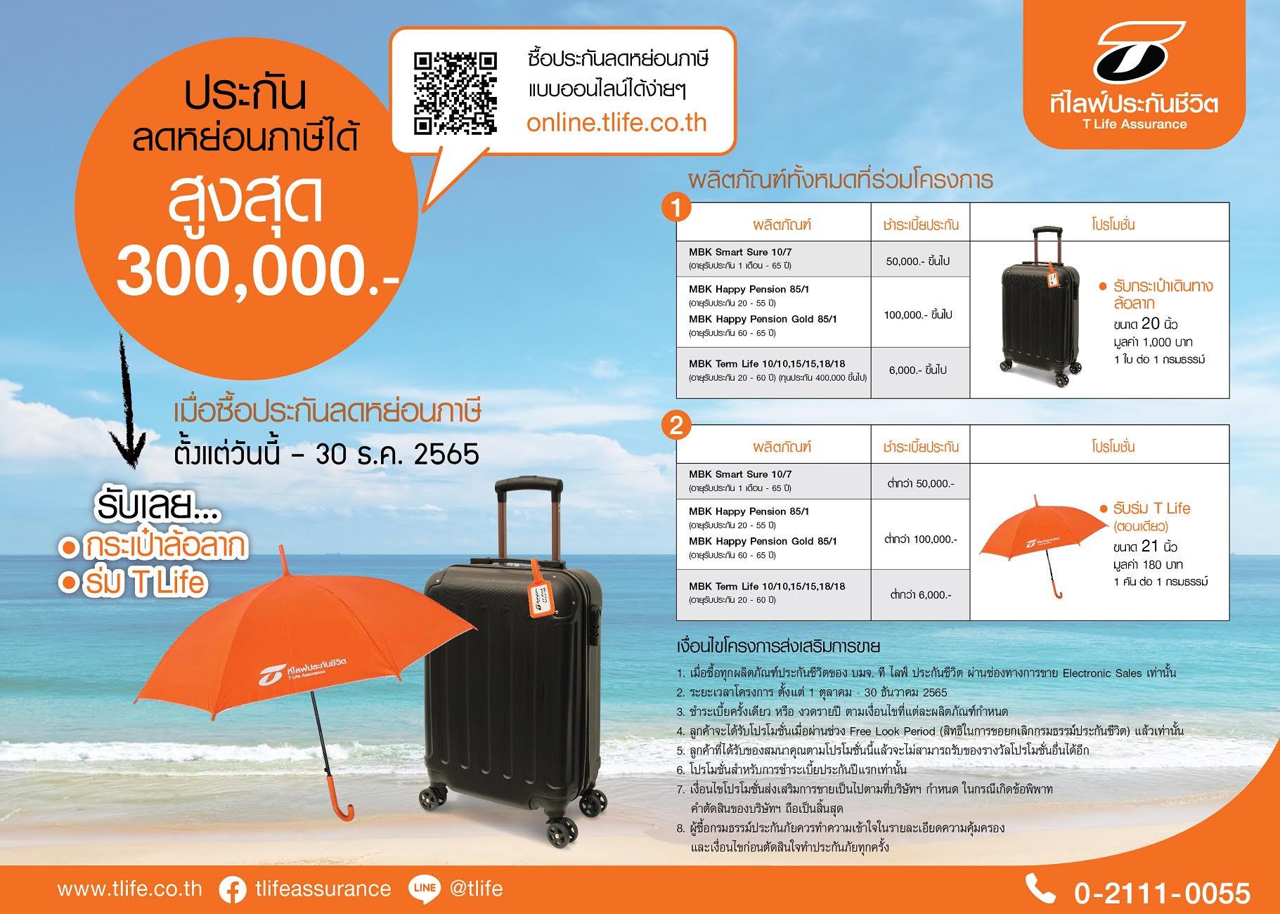 ที ไลฟ์ ประกันชีวิต อัดแคมเปญปลายปีขนผลิตภัณฑ์ประกันชีวิตให้ลูกค้าเลือกซื้อสำหรับใช้สิทธิ์ลดหย่อนภาษีได้สูงสุด 300,000 บาท ตามที่กรมสรรพากรกำหนด พร้อมจัด 2 โปรโมชั่น ผ่อนชำระค่าเบี้ยประกันภัย 0% ผ่านบัตรเครดิต ttb ได้นาน 3-10 เดือน พร้อมรับฟรี! ร่ม T Life ขนาด 21 นิ้ว หรือรับกระเป๋าเดินทางแบบล้อลาก ขนาด 20 นิ้ว เมื่อซื้อกรมธรรม์ตามที่บริษัทฯ กำหนด ตั้งแต่วันนี้ – 30 ธันวาคม 2565
