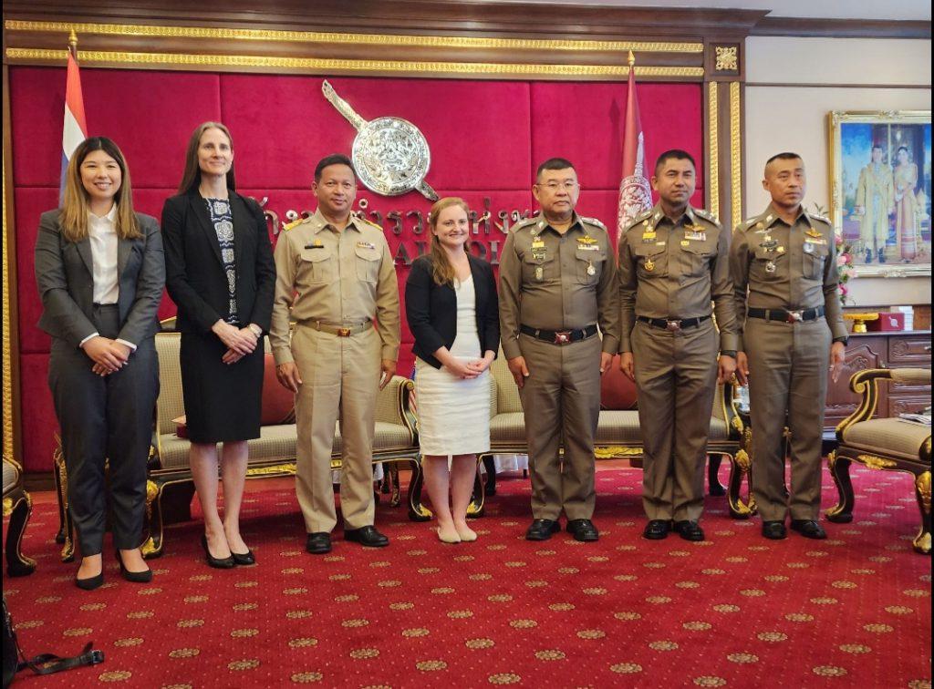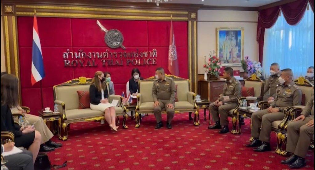 วันที่ 22 พ.ย.65 เวลา 14.00 น. พล.ต.อ.ดำรงศักดิ์ กิตติประภัสร์ ผบ.ตร. พร้อมด้วย พล.ต.อ.สุรเชษฐ์ หักพาล รอง ผบ.ตร. ในฐานะ ผอ.ศพดส.ตร. พร้อมคณะผู้แทนไทยจากหลายหน่วยงานทั้งจากภาครัฐ เช่น กระทรวงการต่างประเทศ กระทรวงยุติธรรม กระทรวงแรงงาน กระทรวงพัฒนาสังคมและความมั่นคงของมนุษย์ และภาคประชาสังคม เช่น LPN IJM Stella maris และ Hug Project ได้ร่วมกันให้การต้อนรับผู้แทนจากสหรัฐอเมริกา นำโดย น.ส.เคทลีน ไฮเดนรีช เจ้าหน้าที่สำนักงานตรวจสอบและต่อต้านการค้ามนุษย์ พร้อมคณะ ได้ให้เกียรติมาเยี่ยมชม ศูนย์พิทักษ์เด็ก สตรี ครอบครัว ป้องกันปราบปรามการค้ามนุษย์ และภาคประมง สำนักงานตำรวจแห่งชาติ (ศพดส.ตร.) ณ อาคาร 1 สำนักงานตำรวจแห่งชาติ เพื่อเยี่ยมชมและสังเกตการณ์การทำงานของ ศพดส.ตร. หลังจากที่ผลการปฏิบัติด้านการดำเนินคดีมีความก้าวหน้าอย่างก้าวกระโดด จนทำให้ประเทศไทยก้าวขึ้นสู่ Tier 2 จากการประเมิน TIP Report ในปีที่ผ่านมา