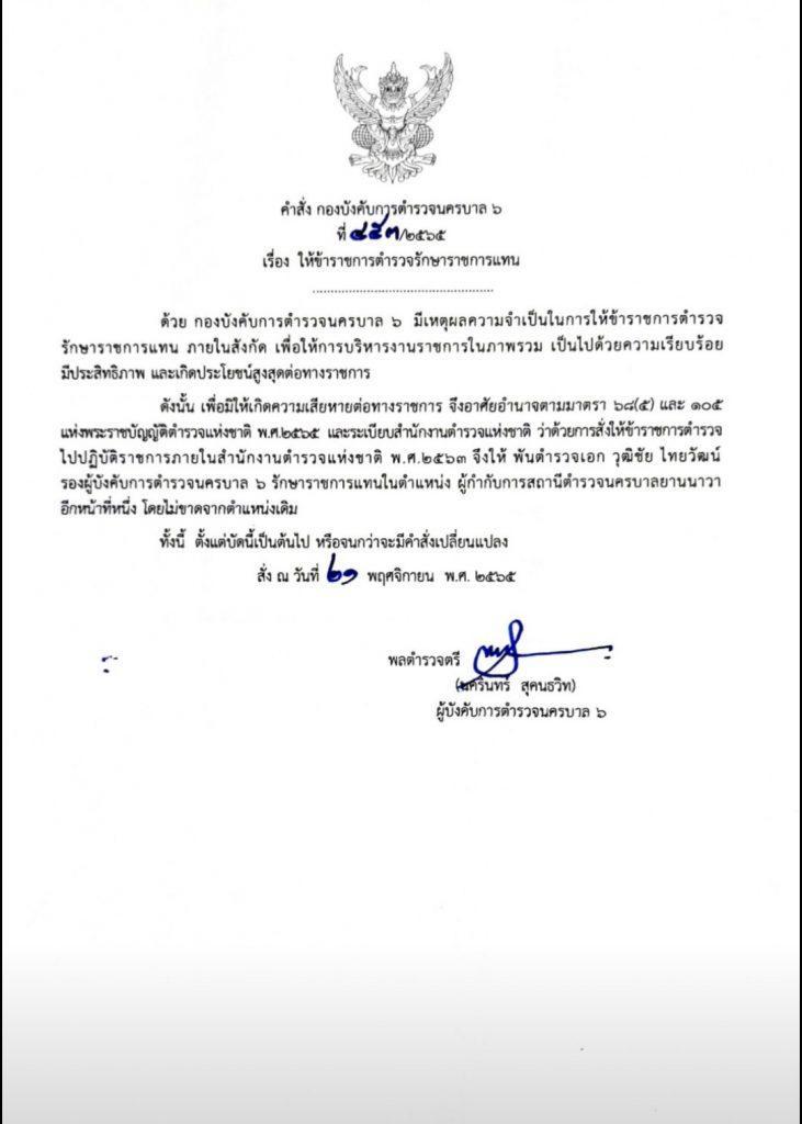 วันที่ 22 พฤศจิกายน 2565 พล.ต.ต.นครินทร์ สุคนธวิท ผู้บังคับการตำรวจนครบาล 6 ลงนามในคำสั่งกองบังคับการตำรวจนครบาล 6 ที่ 453/2565 เรื่องให้ข้าราชการตำรวจรักษาราชการแทน ใจความว่า ด้วยกองบังคับการตำรวจนครบาล 6 มีเหตุผลความจำเป็นในการให้ข้าราชการตำรวจ รักษาราชการแทน ภายในสังกัด เพื่อให้การบริหารงานราชการในภาพรวม เป็นไปด้วยความเรียบร้อย มีประสิทธิภาพ และเกิดประโยชน์สูงสุดต่อทางราชการ ดังนั้น เพื่อมิให้เกิดความเสียหายต่อทางราชการ จึงอาศัยอำนาจตามมาตรา 68(5) และ 105 แห่งพระราชบัญญัติตำรวจแห่งชาติ พ.ศ.2565 และระเบียบสำนักงานตำรวจแห่งชาติ ว่าด้วยการสั่งให้ข้าราชการตำรวจไปปฏิบัติราชการภายในสำนักงานตำรวจแห่งชาติ พ.ศ.2563 จึงให้ พ.ต.อ.วุฒิชัย ไทยวัฒน์ รองผู้บังคับการตำรวจนครบาล 6 รักษาราชการแทนในตำแหน่ง ผู้กำกับการสถานีตำรวจนครบาลยานนาวา อีกหน้าที่หนึ่ง โดยไม่ขาดจากตำแหน่งเดิม ทั้งนี้ ตั้งแต่บัดนี้เป็นต้นไป หรือจนกว่าจะมีคำสั่งเปลี่ยนแปลง สั่ง ณ วันที่ 21 พฤศจิกายน พ.ศ.2565